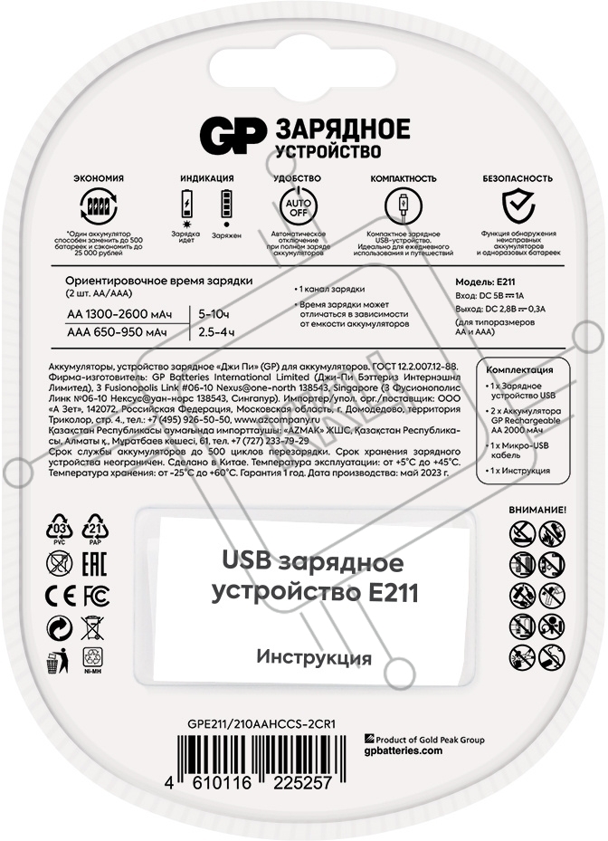 Зарядное устройство GP Rechargeable E211/210AAHCCS-2CR1 AA/AAA NiMH 2100mAh (2шт) блистер