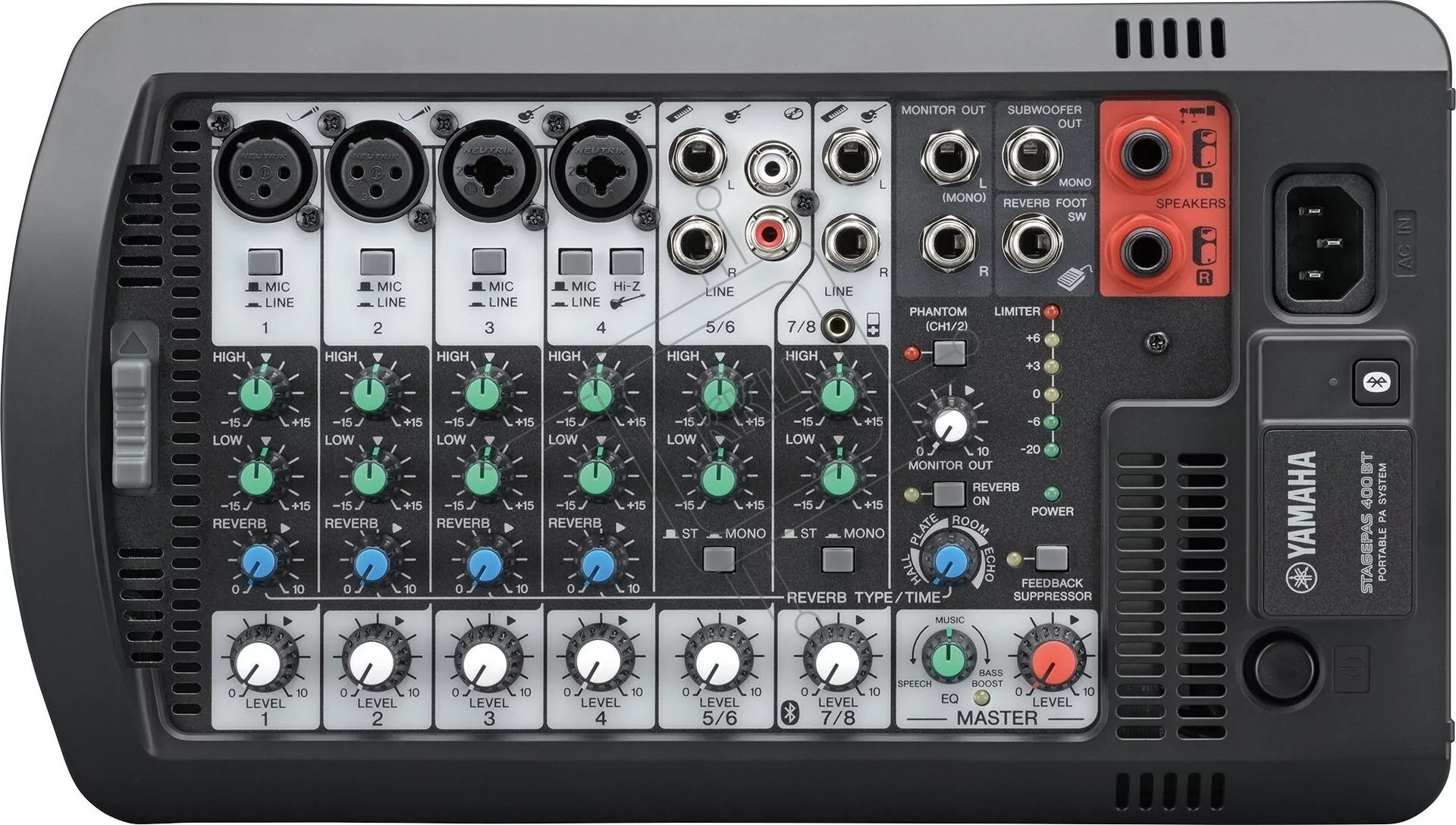 Система звукоусиления Yamaha STAGEPAS400BT портативная, 400 Вт, 2 х 8"+1", 8-канальный микшер (4 моно/линейных входа + 4 моно/2 стерео линейных входа), Входы Hi-Z (с высоким сопротивлением), Bluetooth