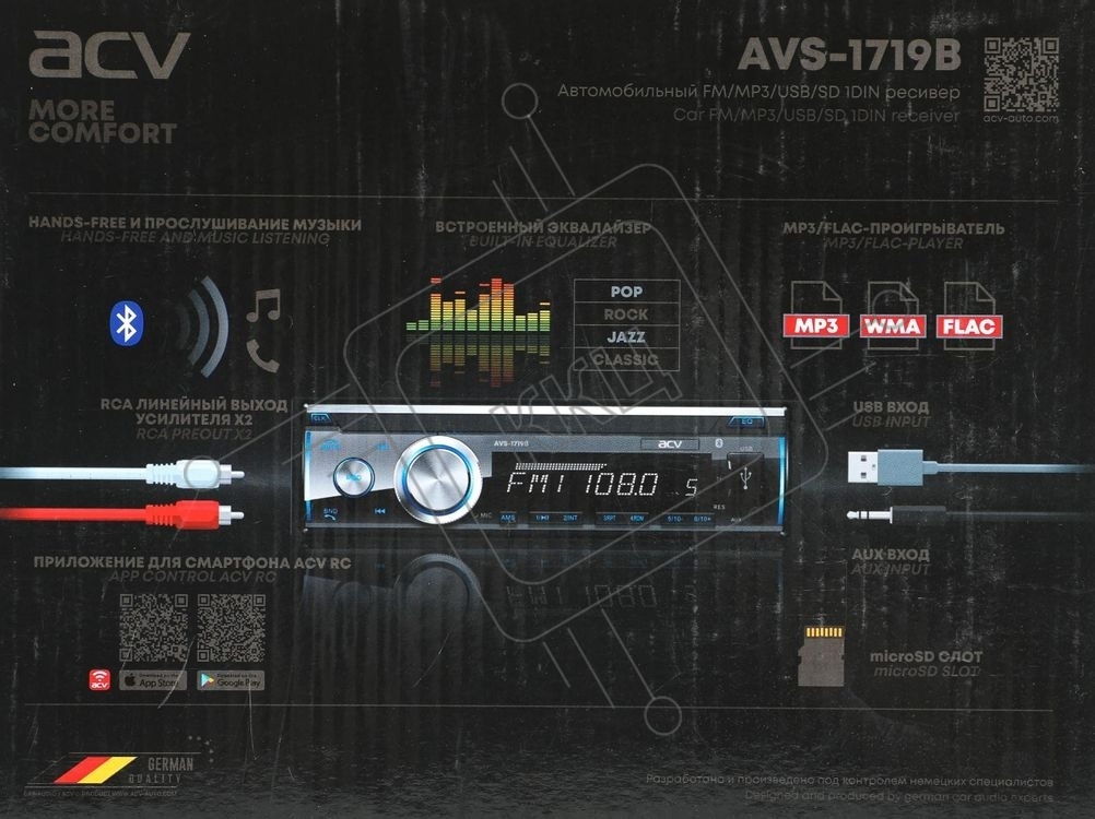 Автомагнитола ACV AVS-1719B, 1 DIN, Bluetooth, USB Type-A, AUX