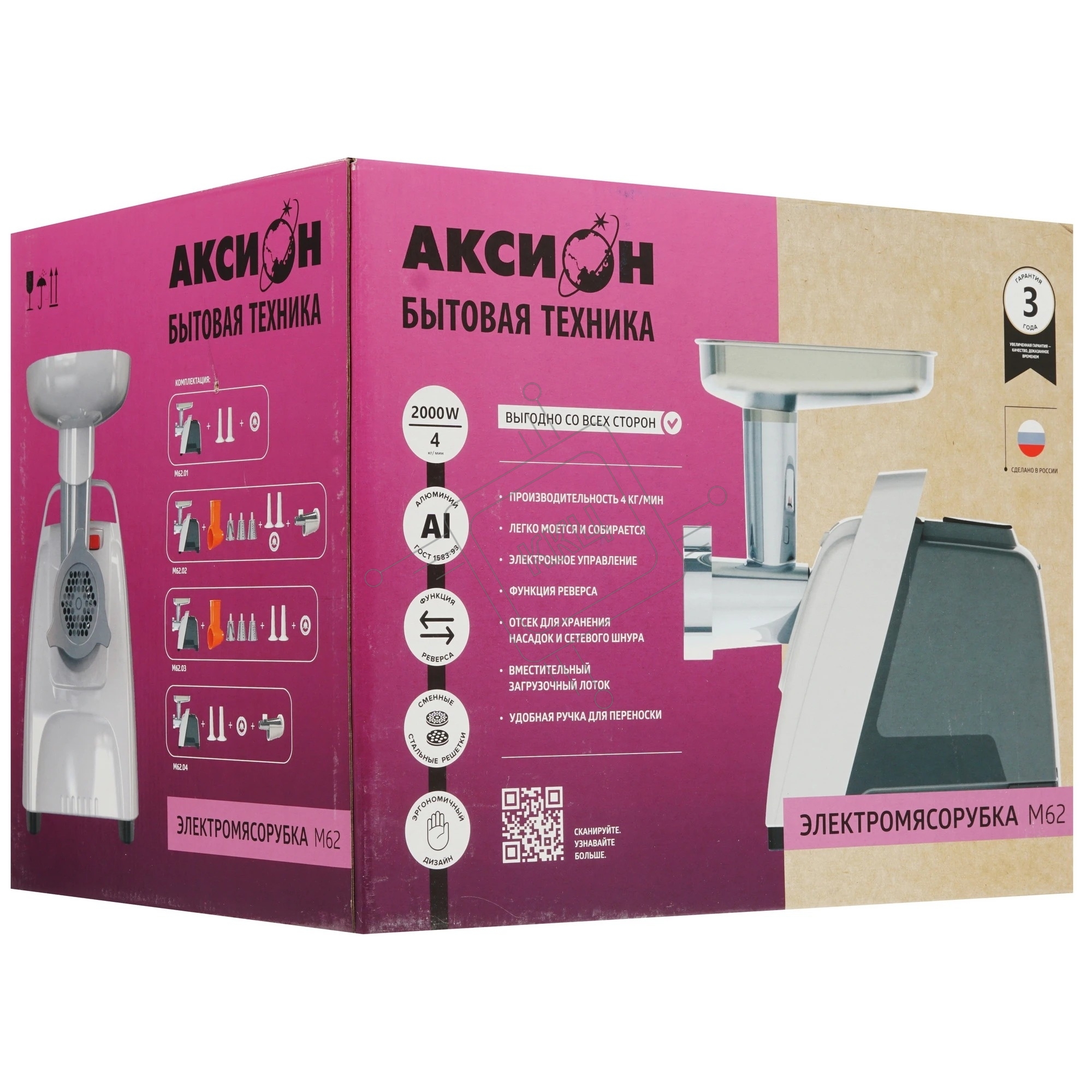 Мясорубка электрическая Аксион М62.01 черный, 2000 Вт, 4.0 кг/мин, реверс, защита от перегрузки, насадки - 4