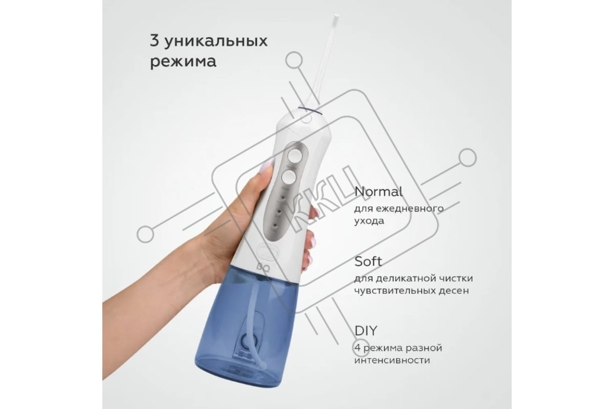 Ирригатор BQ IR001 White-Blue, Мощность: 10 Вт, Портативный, Объем резервуара 300 мл, 2 насадки и дорожный чехол в комплекте, 3 режима работы: Normal (нормальный), Soft (мягкий), Pulse (импульсный), Уровень влагозащиты: IPX7, Давление воды: 140-800 кПа, Ч