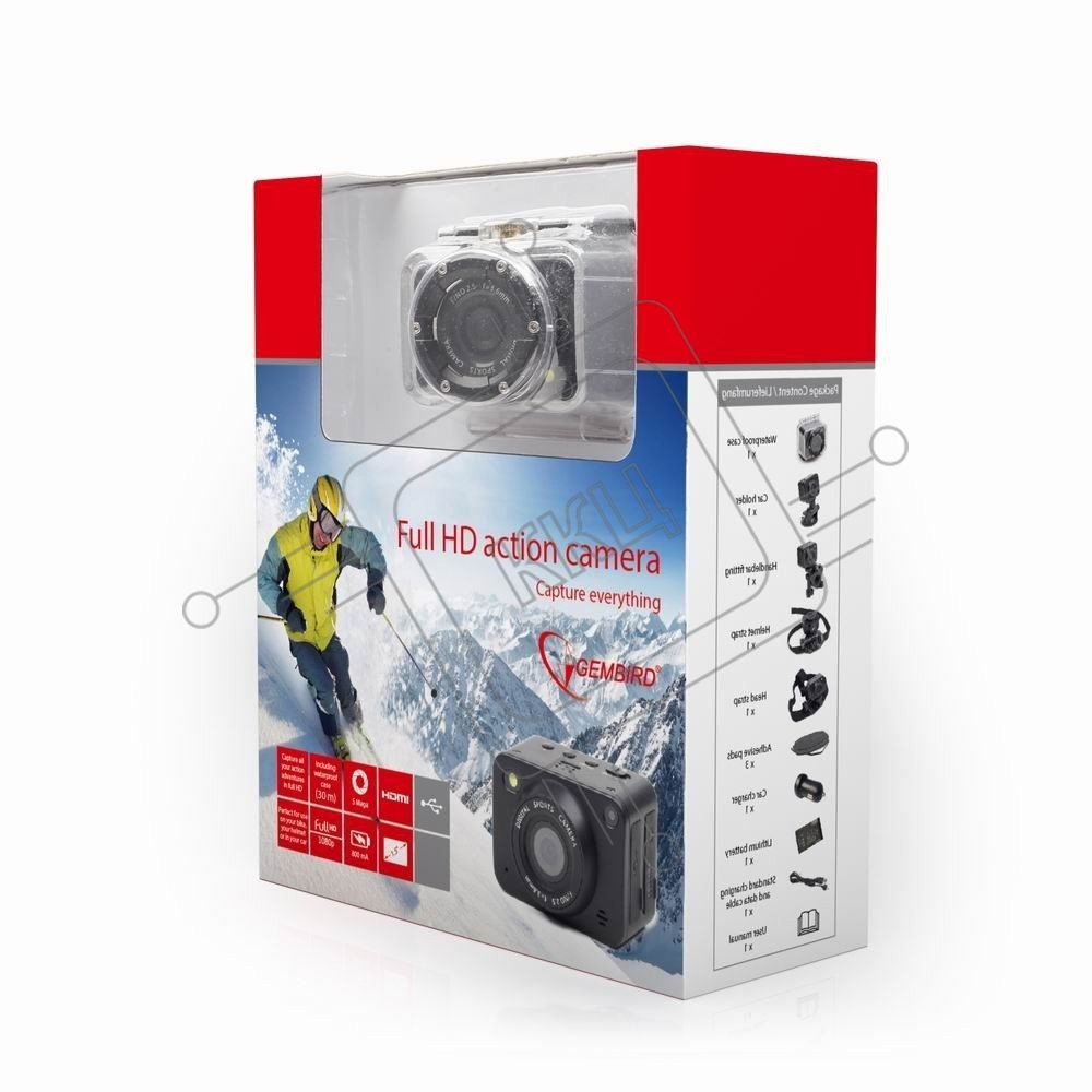 Цифровые камеры Gembird Экшн-камера Gembird ACAM-001, 5MP, 1920 x 1080 FHD (30 fps), ночная съемка, лазерный целеуказатель ЖК дисплей 1.5', TF/Micro SDHC, USB 2.0, HDMI, подводный бокс + крепления.