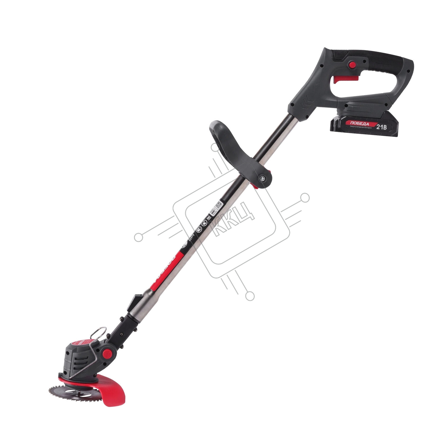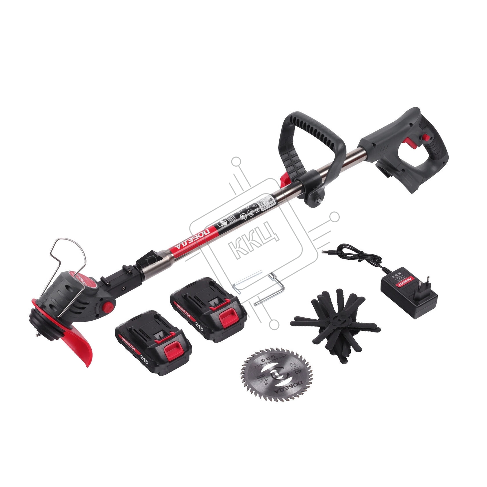 Триммер аккумуляторный Победа ТА 202, 20/21В, с 2 акб 1,5Ач и зу, макс 145мм, пластик. ножи (10шт) + мет. диск 40Т, телескоп