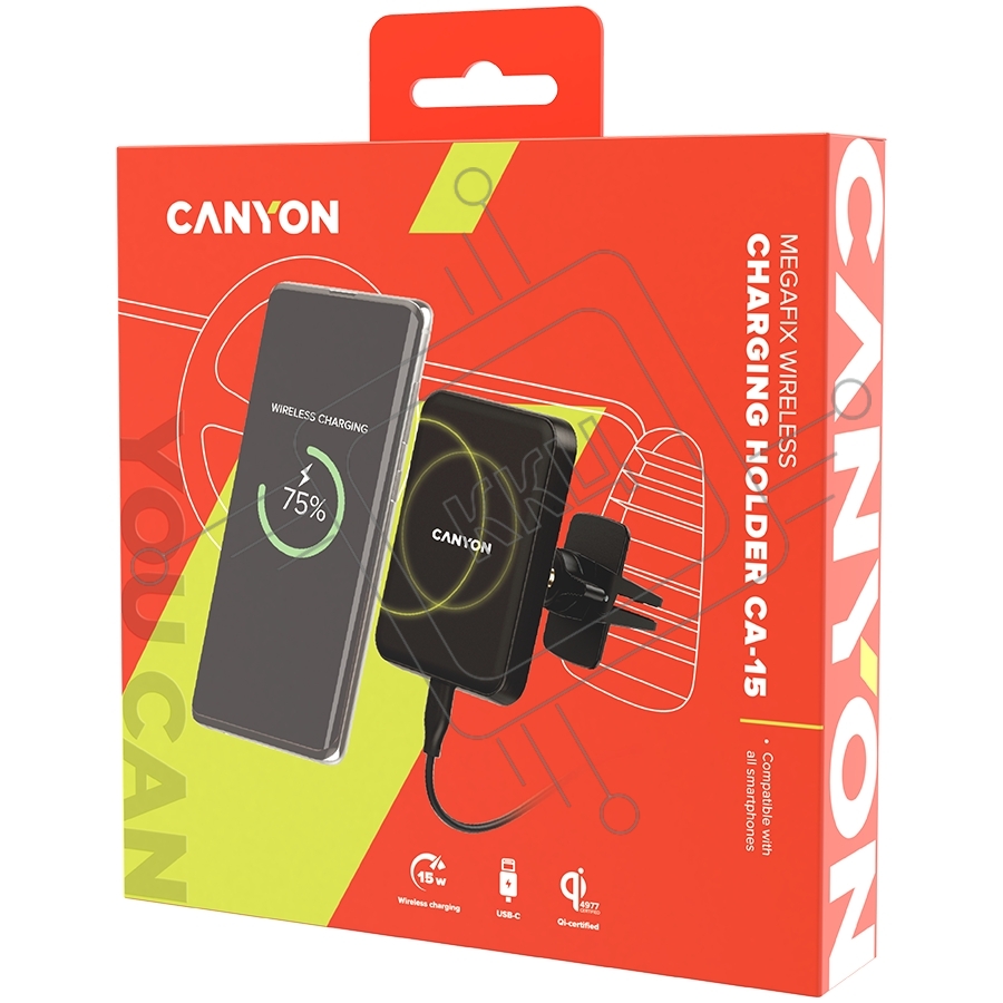 Универсальный магнитный автомобильный держатель с беспроводной зарядкой Car holder and wireless charger MegaFix, C-15, 15W, Input: USB-C: 5V/2A, 9V/3A; Output: 5W, 7.5W, 10W, 15W;89*65*12mm,0.195kg,black