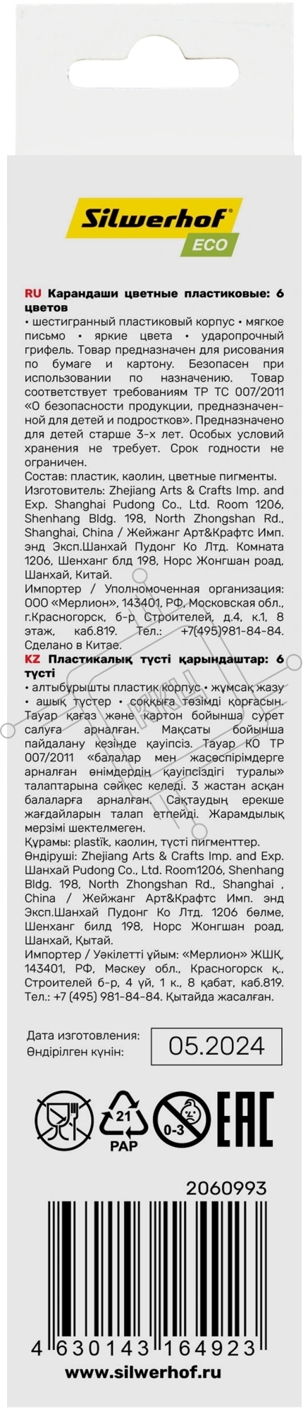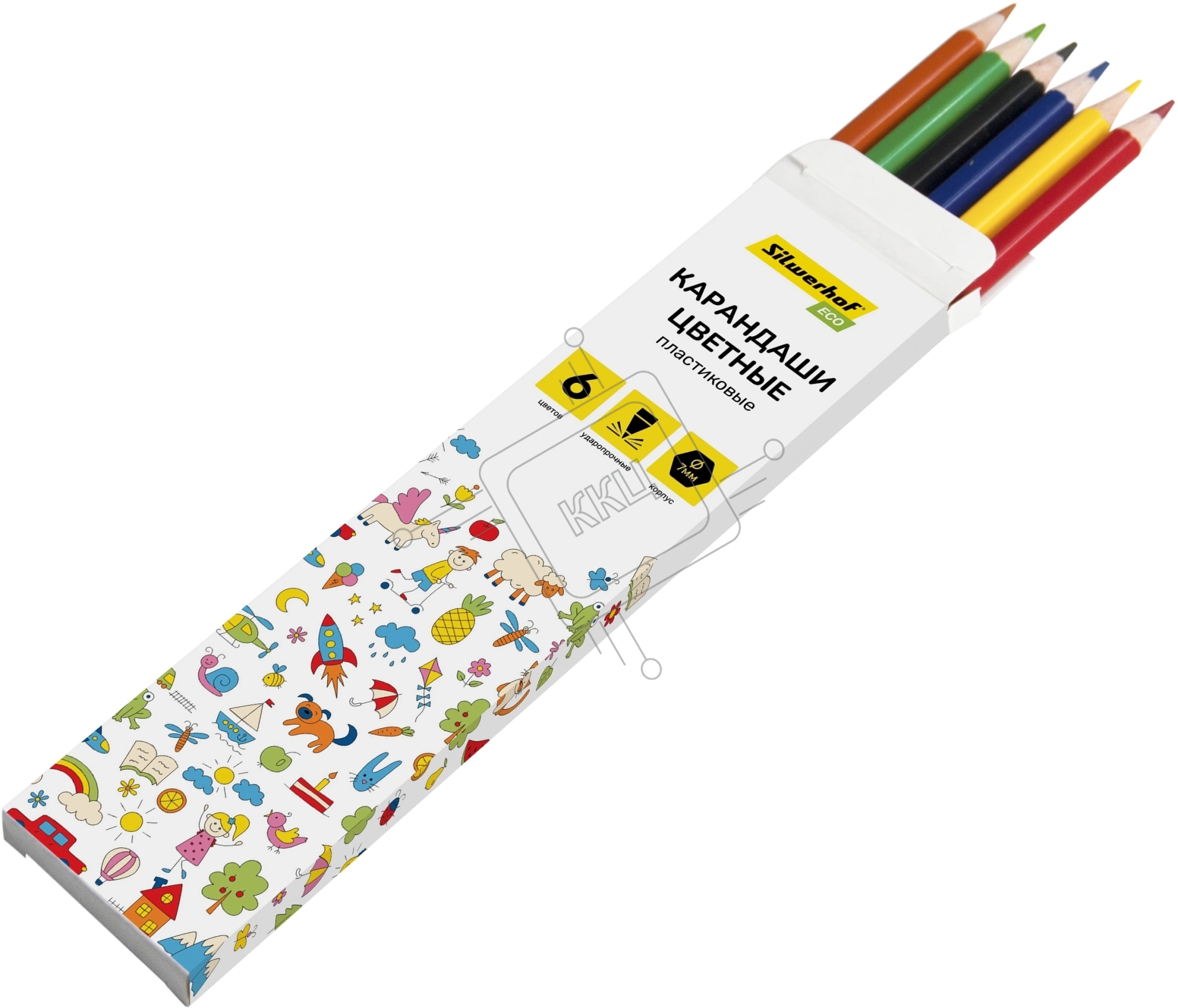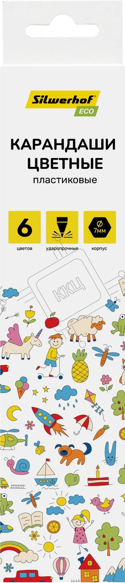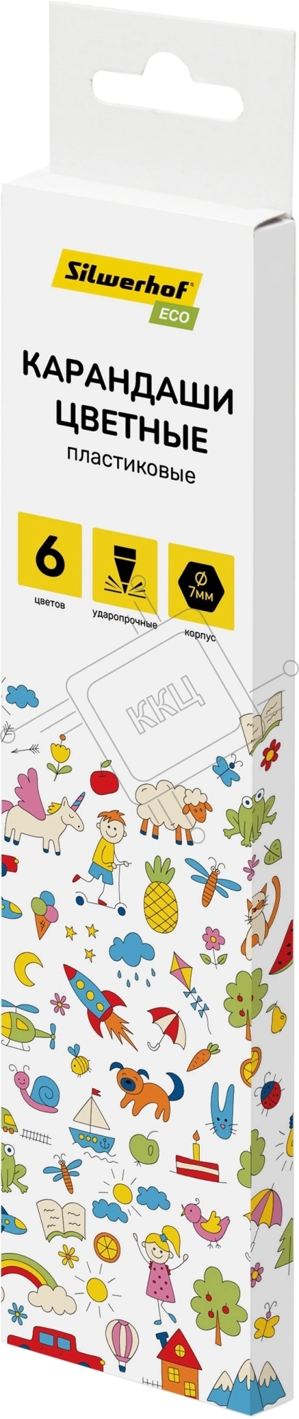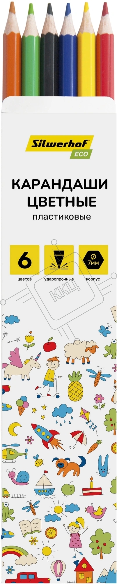Карандаши цветные Silwerhof Eco 2.6 мм, шестигранный профиль, пластик, ассорти, 6 цветов, коробка с европодвесом