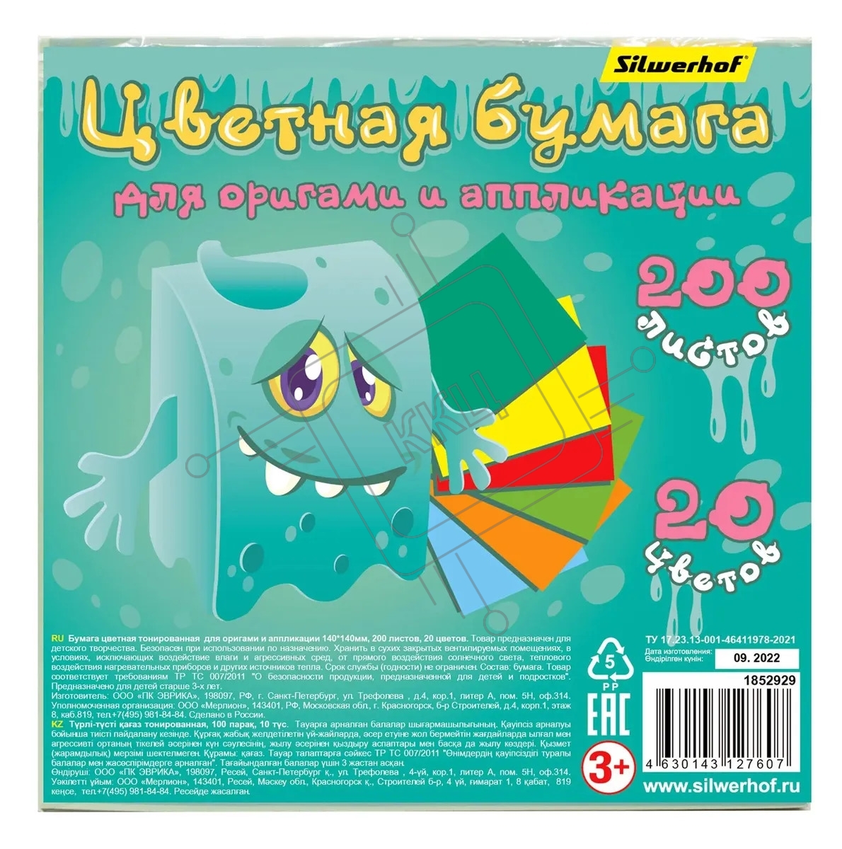 Бумага цветная Silwerhof для оригами и аппликации ассорти тонир. 200л. 20цв. Монстрики 80г/м2 140х140мм