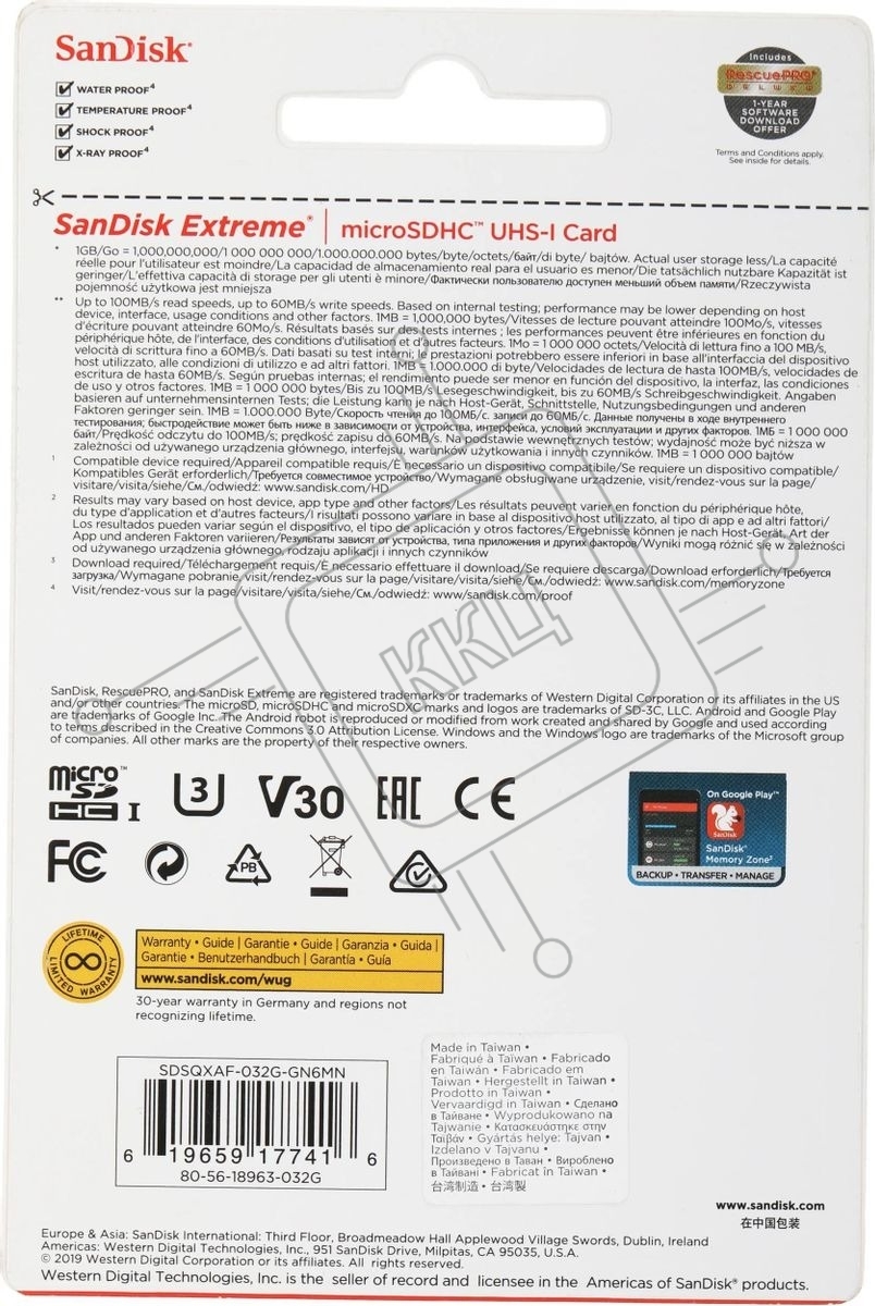 Карта памяти 32GB SanDisk microSDXC Class 10 UHS-I A1 C10 V30 U3 Extreme 100MB/s