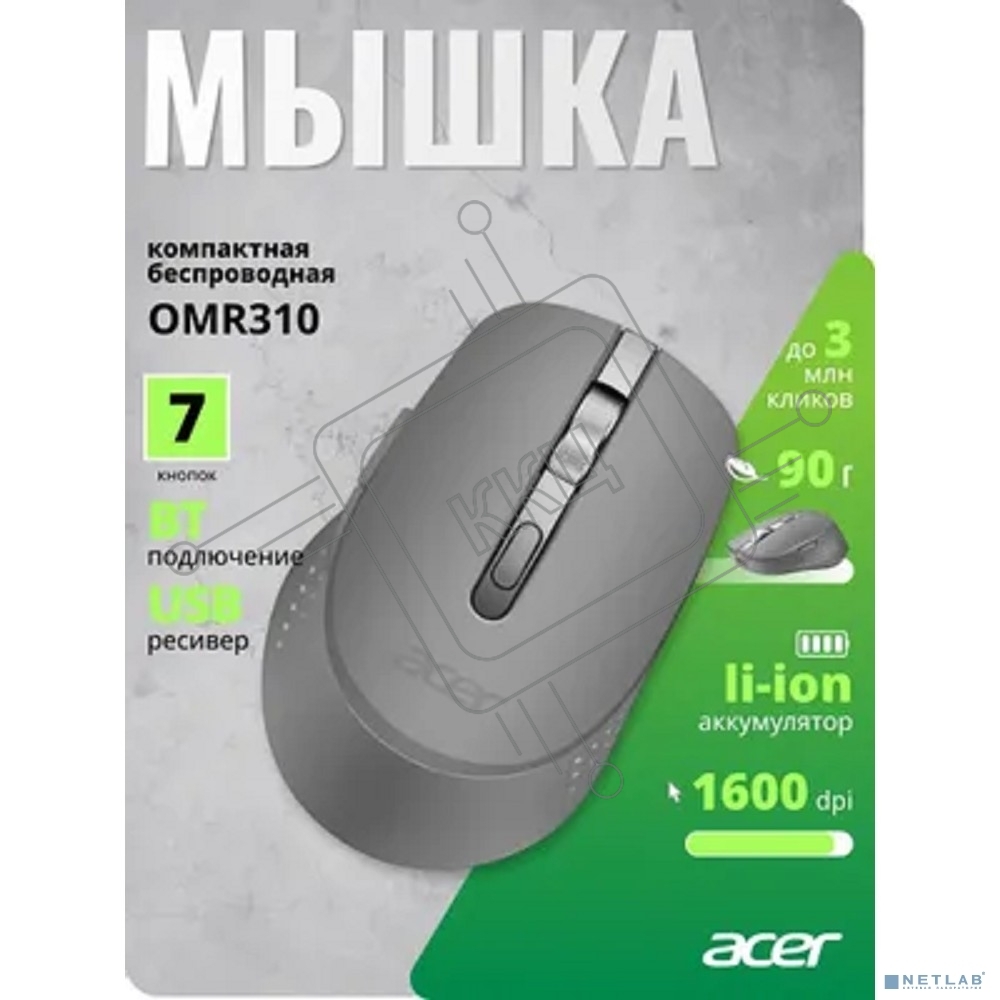 Мышь беспроводная Acer OMR310 темно-серый, 1600 dpi, радиоканал, Bluetooth, USB, кнопки - 7