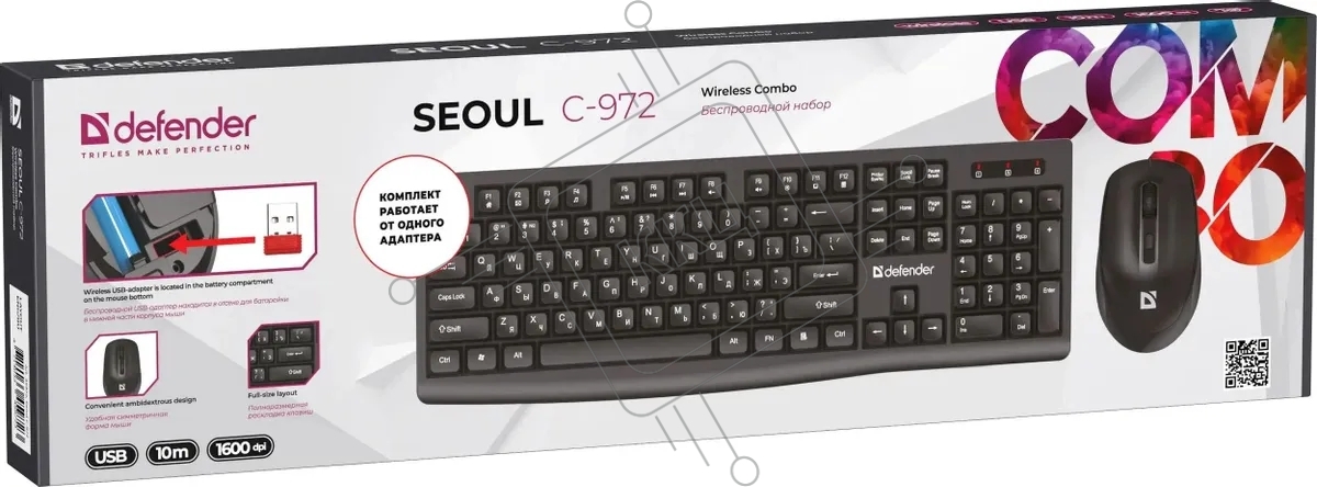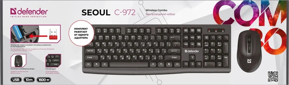 Комплект клавиатура+мышь Defender C-972 беспроводной, USB, 1600 DPI, черный