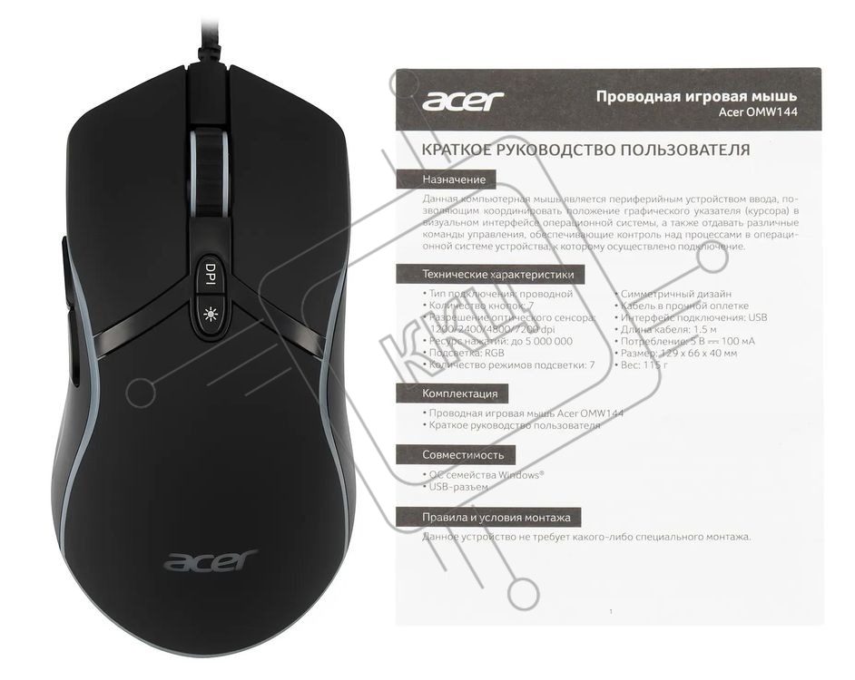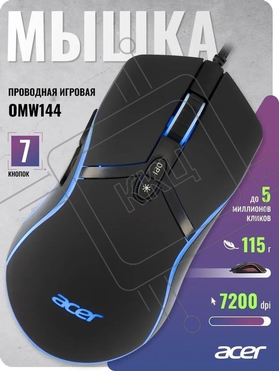 Мышь проводная Acer OMW144 черный, 3200 dpi, USB, кнопки - 7
