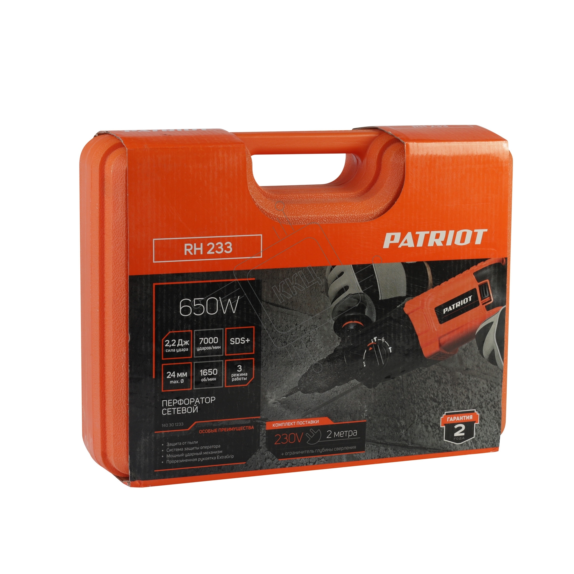 Перфоратор Patriot RH 233, SDS+, мощность 650Вт, 2,2 Дж, 3 режима работы, макс.диаметр 24мм, глубиномер, дополнительная ручка, кейс