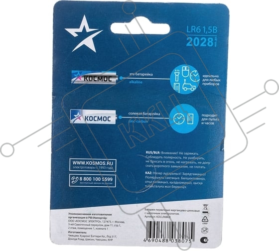 Элемент питания алкалиновый AA/LR06 BP-8 (блист.8шт) КОСМОС KOCLR6BL8
