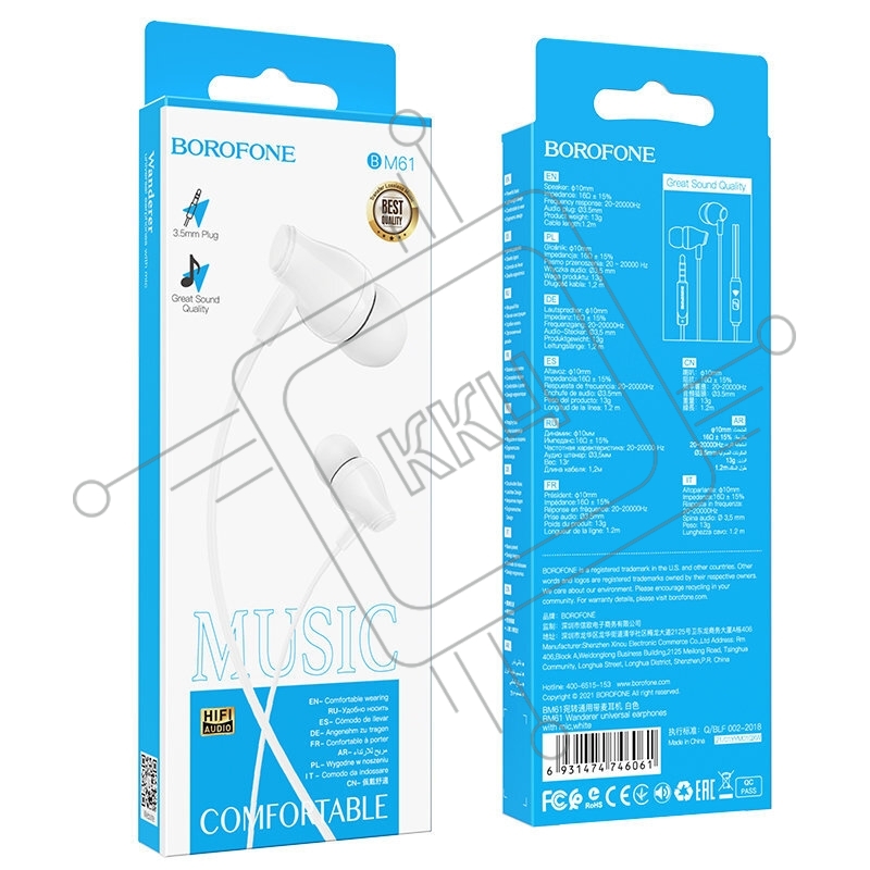 Наушники вакуумные AUX разъем с МК без рег.громкости длина 1.2м Borofone BM61 (White)