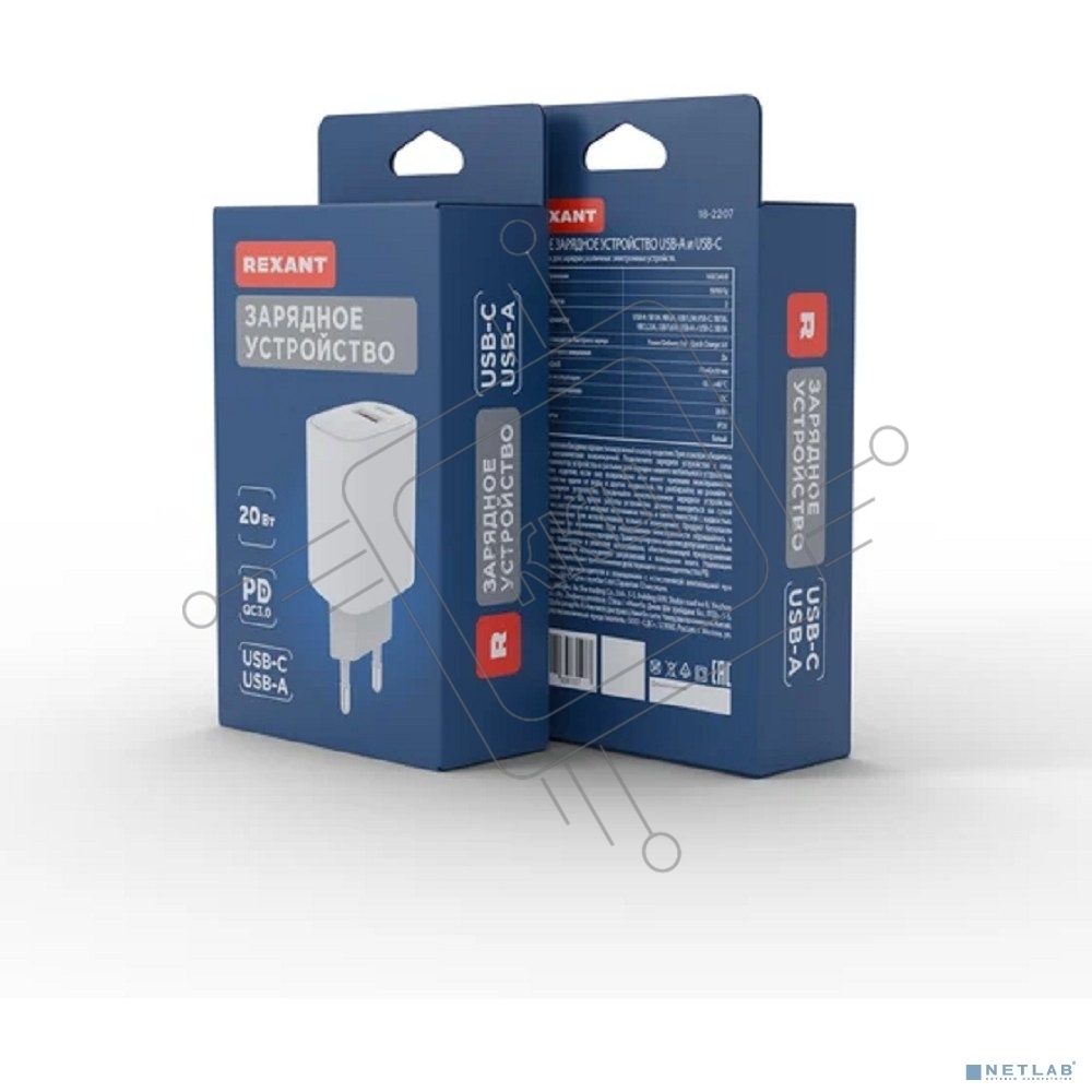 Сетевое зарядное устройство с двумя портами USB-A + USB-C, 20Вт Rexant