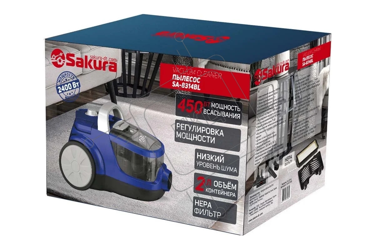 Пылесос Sakura SA-8314BL синий металлик, 450/2400 Вт, уборка сухая, пылесборник контейнер, 2 л