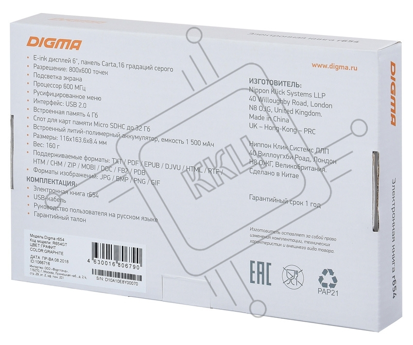 Электронная книга Digma R654 6" E-Ink Carta 800x600 600MHz/4Gb/microSDHC/подсветка дисплея графит
