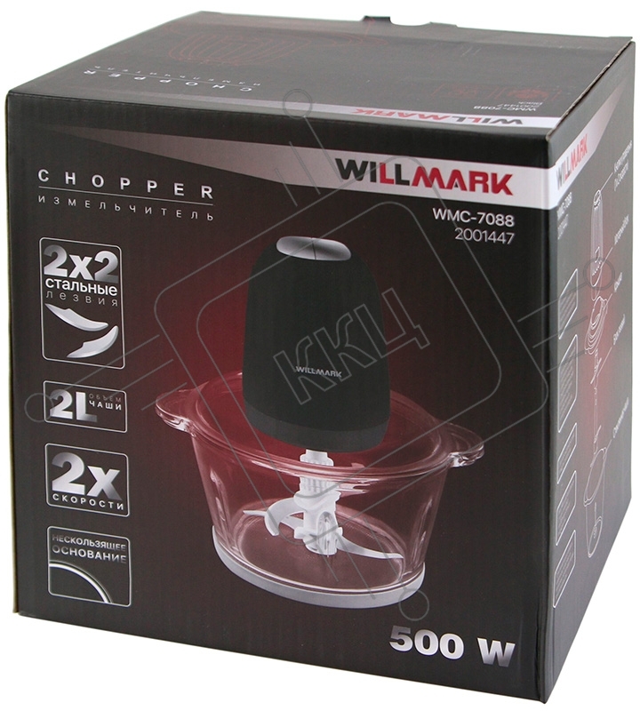 Измельчитель Willmark WMC-7088 (500Вт., стекл. чаша 2л., двойн. лезвия., рез. основание) черный