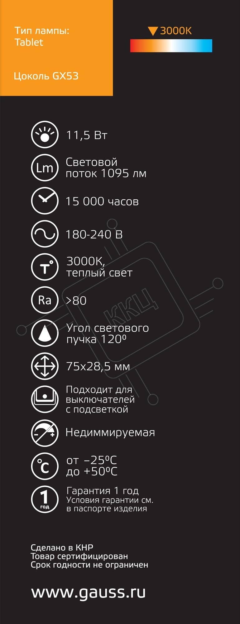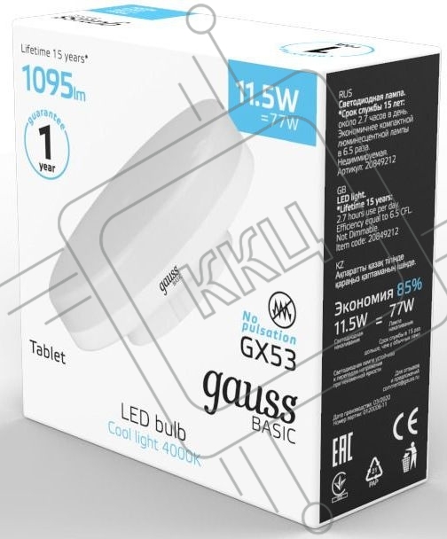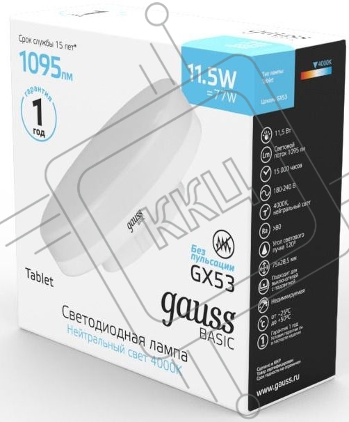 Лампа светодиодная Gauss Basic 20849112 11.5Вт цок.:GX53 таблетка 180B 3000K св.свеч.бел.теп. (упак.:10шт)