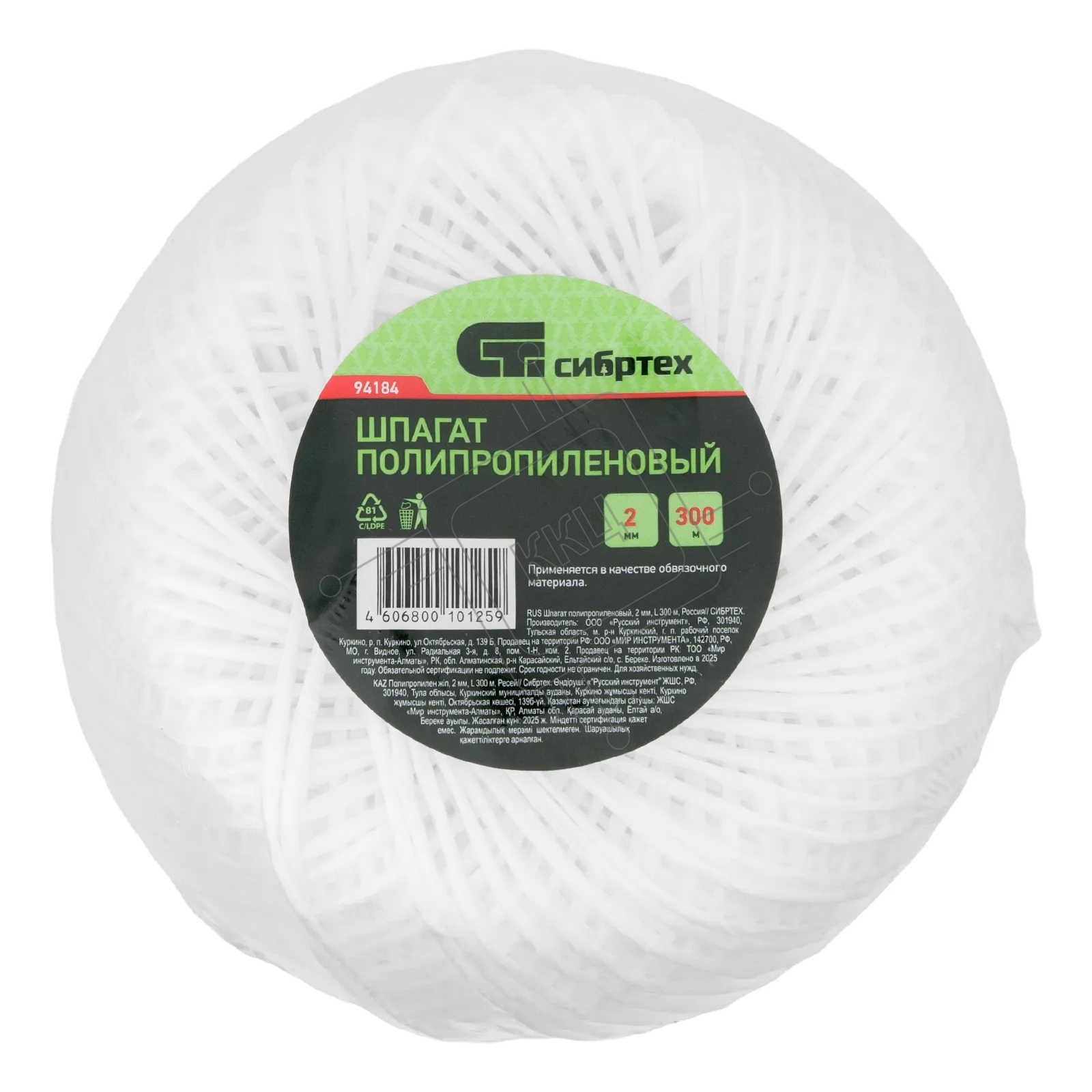 Шпагат полипропиленовый Сибртех, 2,0 мм, L 300 м