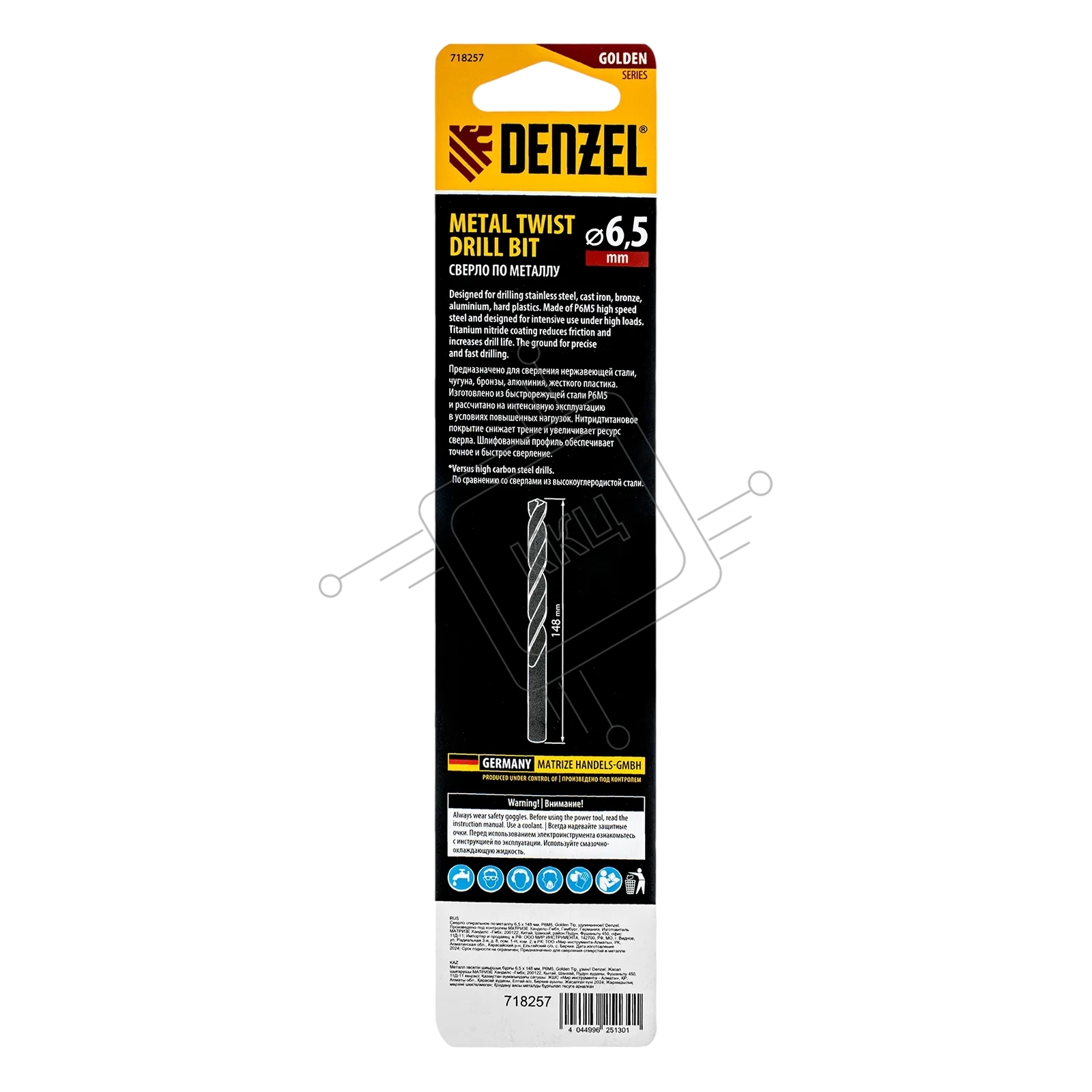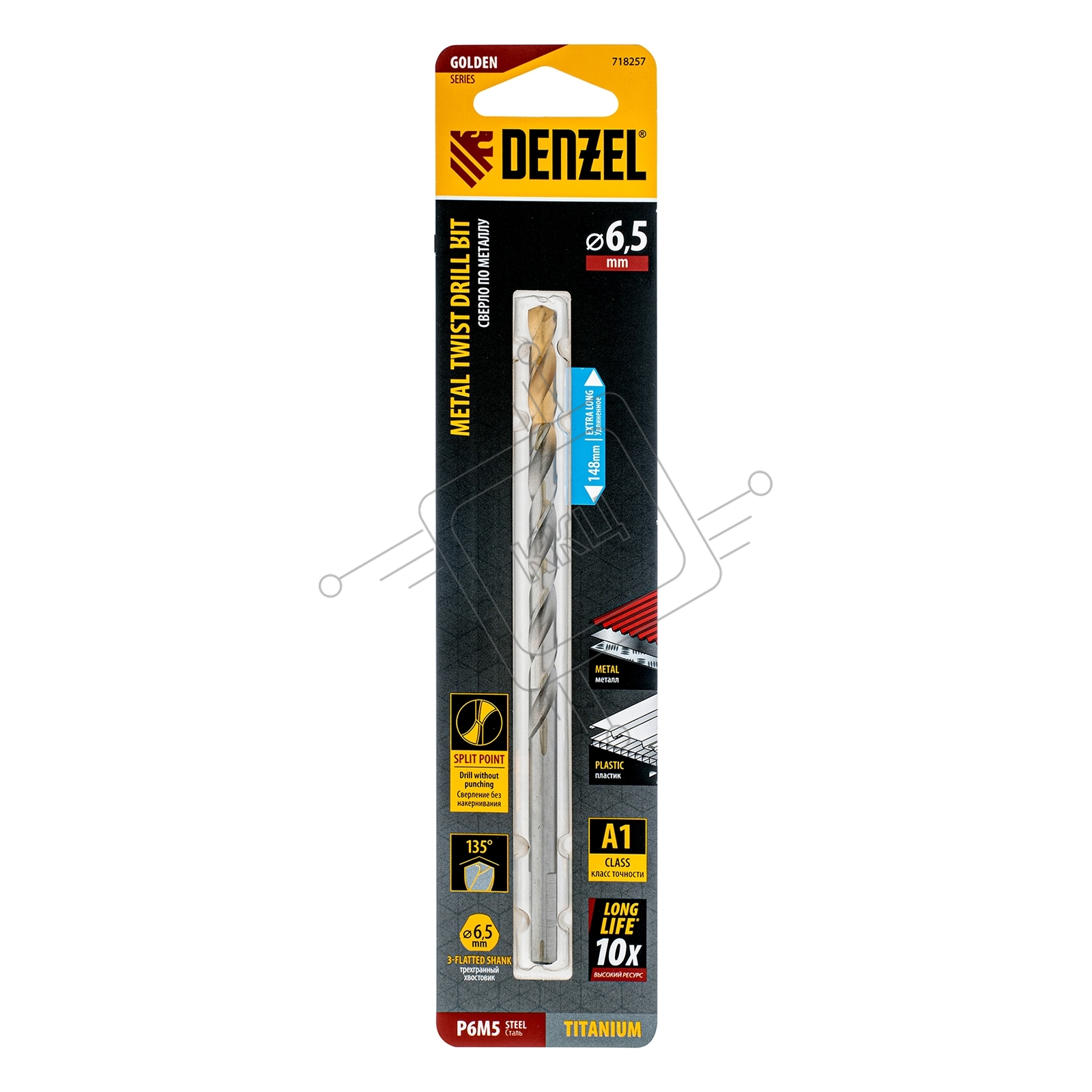 Сверло спиральное по металлу Denzel 6,5 х 148 мм, Р6М5, Golden Tip, удлиненное