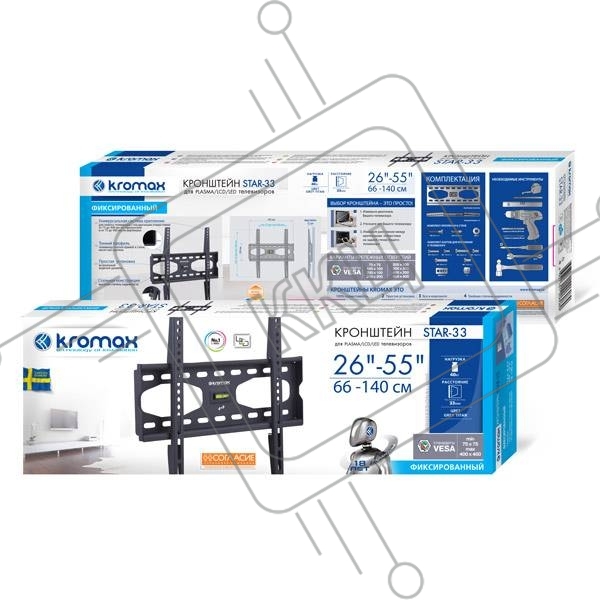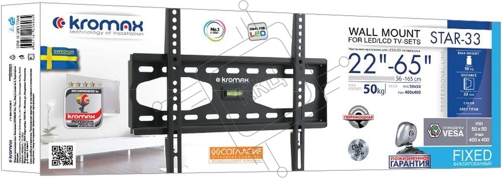 Крепеж Kromax STAR-33 new черный, Кр. стал. настенный для TV 22"-65", max 75 кг, 0 ст св., от ст. 40 мм, max VESA 400x400 мм.