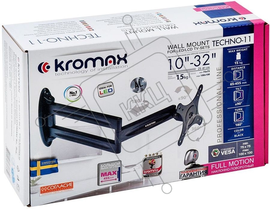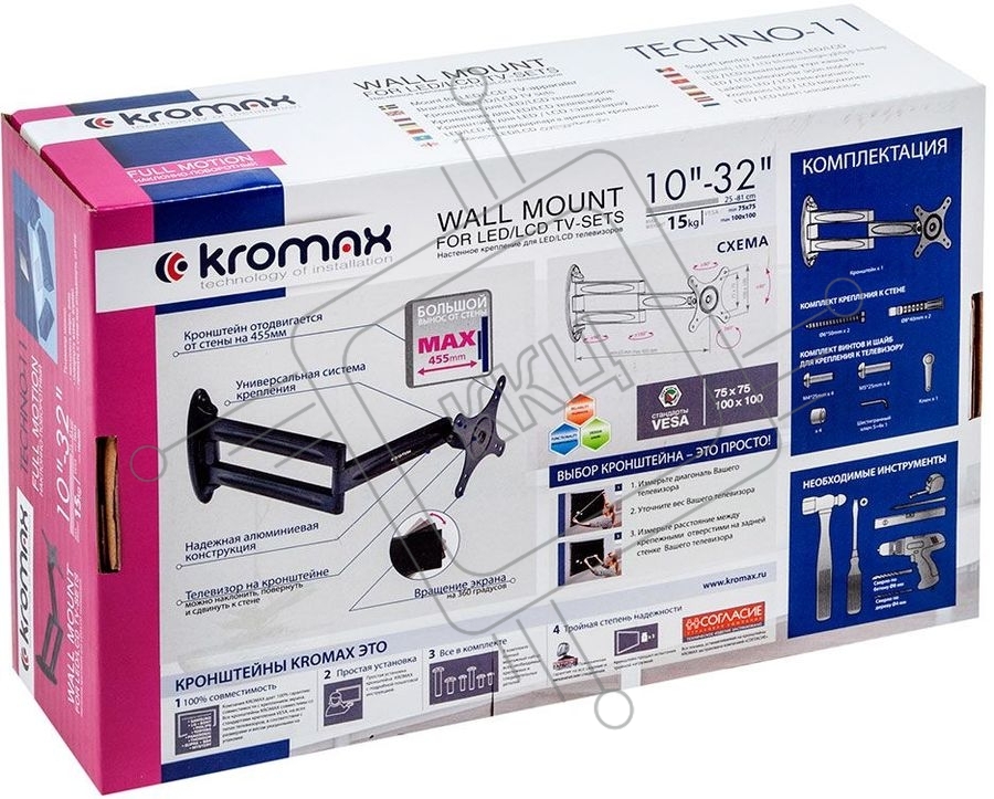 Кронштейн для телевизора Kromax TECHNO-11 черный 10"-32" макс.15кг настенный поворот и наклон