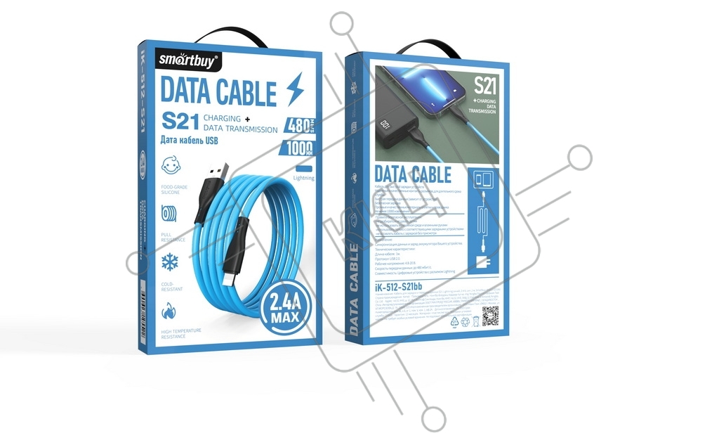 Кабель Smartbuy S21 USB - Lightning, 2.4A, 1м, оплетка силикон, синий (iK-512-S21bb)