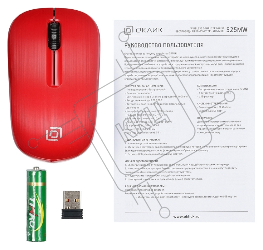 Мышь беспроводная Oklick 525MW красный, 1000 dpi, радиоканал, USB, кнопки - 3