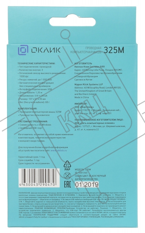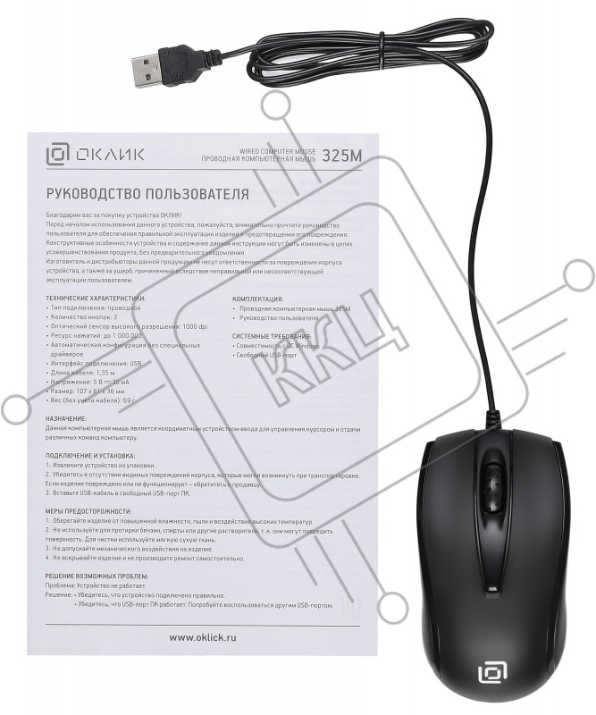 Мышь проводная Oklick 325M черный, 1000 dpi, USB, кнопки - 3