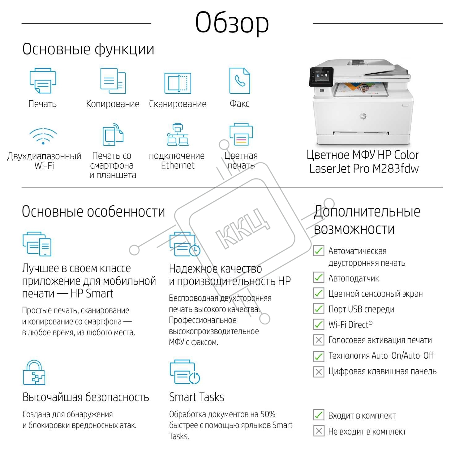 МФУ лазерное HP Color LaserJet Pro M283fdw (7KW75A), A4, цветной, печ. до 21 стр/мин., скан. до 26 стр/мин. (ч/б) 22 стр/мин. (цвет), 600 x 600 dpi (печать) 300x300dpi (скан), USB, RJ-45, Wi-Fi, Air Print, Mopria