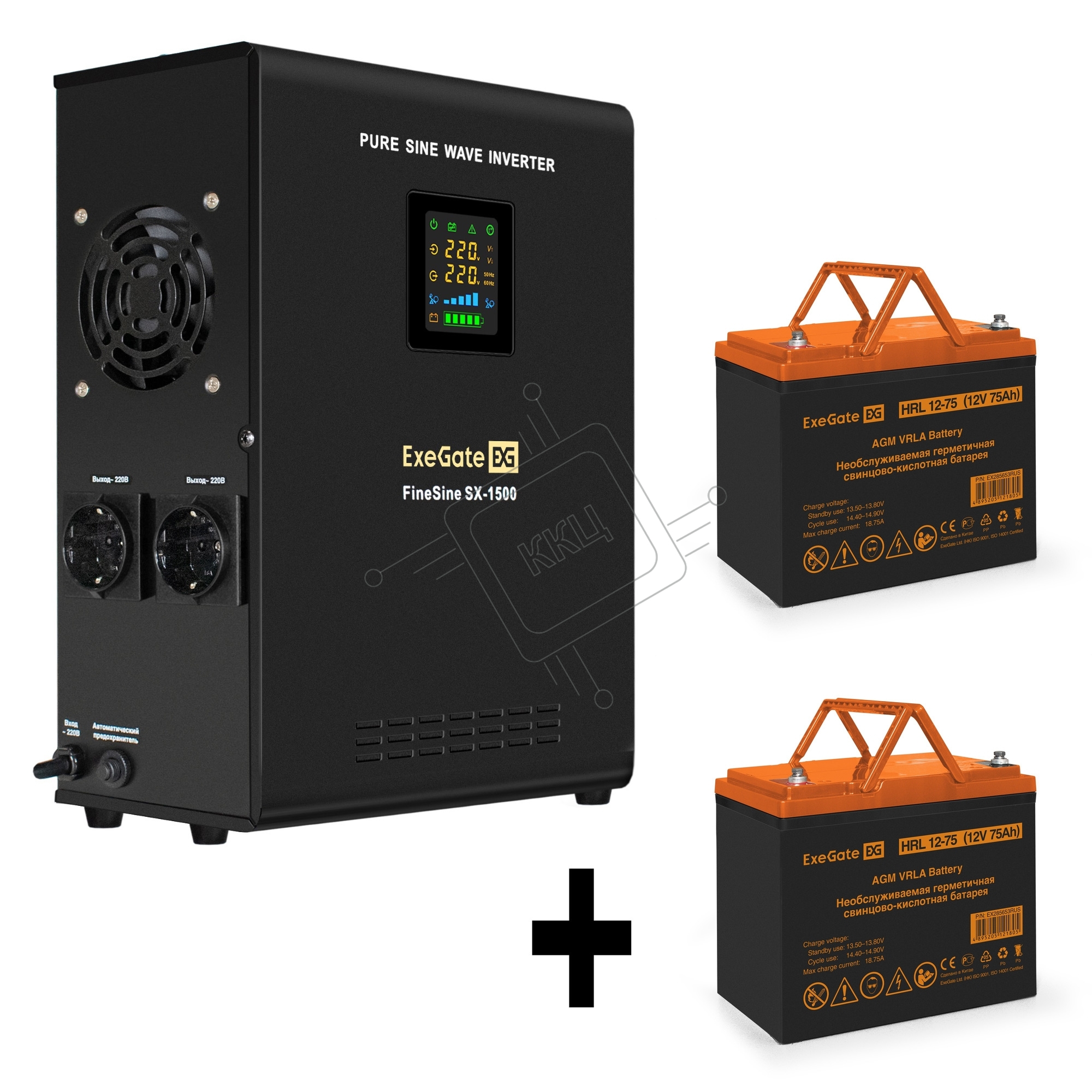 Комплект источника бесперебойного питания Exegate EX295998RUS + батарея 75Aч EX285653RUS 2шт (инвертор, синус, для котла, настенный) ExeGate FineSine SX-1500.LCD.AVR.2SH <1500VA/1050W, чистая синусоида, цветной LCD-дисплей, AVR, 2*Schuko, линейно-интеракт