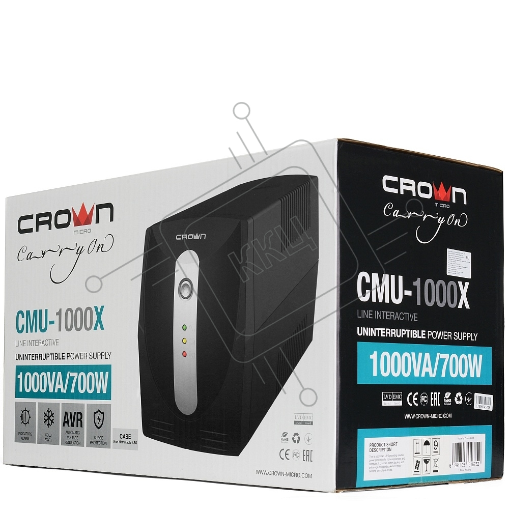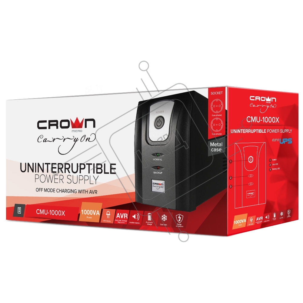 Источник бесперебойного питания Crown CMU-1000X (1000VA/600w; Off-Line; 2 х Euro с резервным питанием и фильтрацией; 12V7AH х 2; Металл)