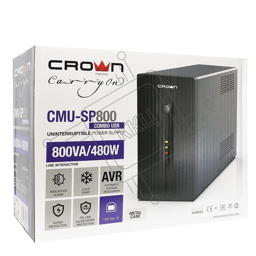 Источник бесперебойного питания CROWN Line Intractive CMU-SP800 COMBO USB 800VA\480W, корпус металл, 1x12V/9AH, розетки 4*IEC + 2*EURO+1*IEC bybass, трансформатор AVR 140-290V, съёмный кабель 1.2 м, порт RJ11/45, порт USB, защита: от перегрузки, от КЗ, от