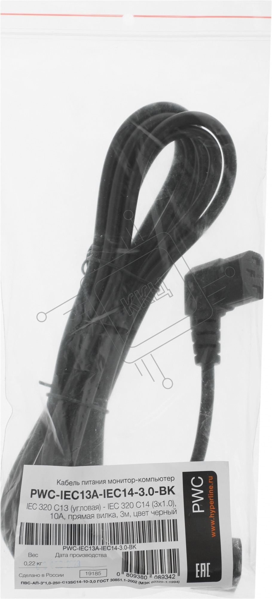Кабель питания Hyperline PWC-IEC13A-IEC14-3.0-BK монитор-компьютер IEC 320 C13 (угловая) - IEC 320 C14 (3x1.0), 10A, прямая вилка, 3м, черный
