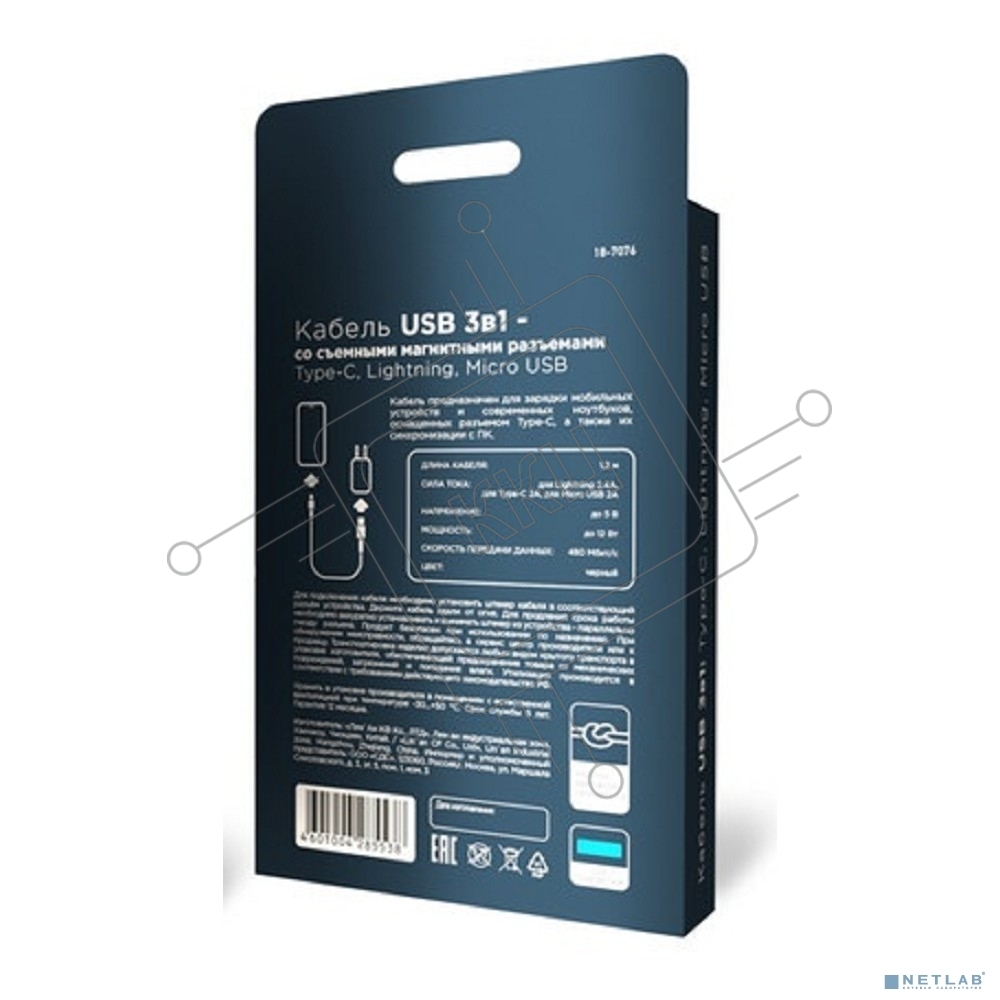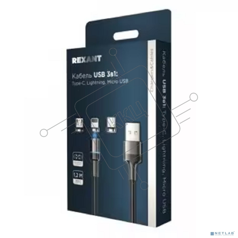 Кабель USB Rexant 18-7076 3в1 со съемными магнитными портами, Type-С (2A), Lightning (2,4A), Micro USB (2A), 1,2м, в черной оплетке, с LED подсветкой