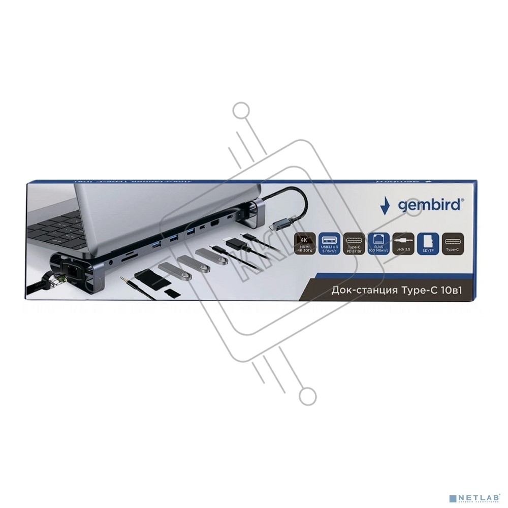 Док-станция Type-C Gembird UHB-D5, 10в1: 3xUSB3.1, Type-C PD87W, Jack 3.5, SD/TF, HDMI, RJ45, Type-C, кабель 14см, алюминий