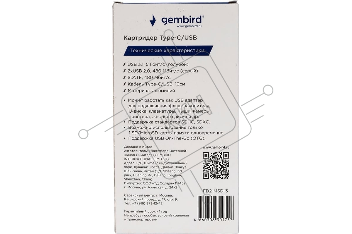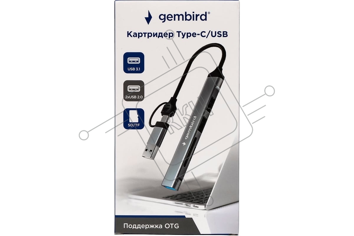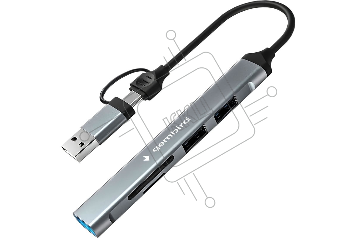 Кард-ридер Type-C/USB-A (3.1) Gembird 5в1: 2xUSB 2.0, USB3.1, SD/TF, кабель 10 см, алюминий