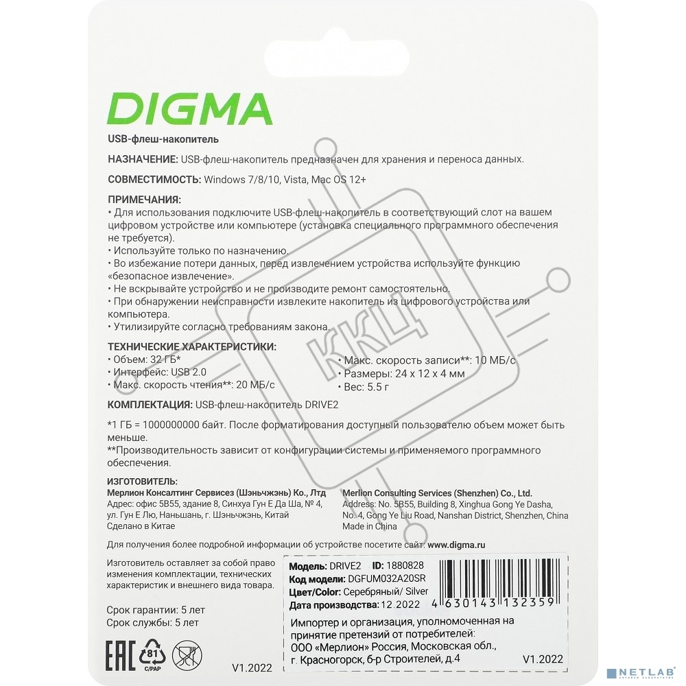 Флешка USB Digma 32 Gb DRIVE2 DGFUM032A20SR USB 2.0 серебристый