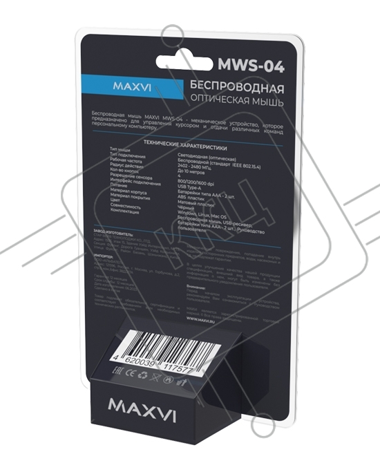 Мышь беспроводная Maxvi MWS-04 черный, 4 кнопки, 1600 dpi
