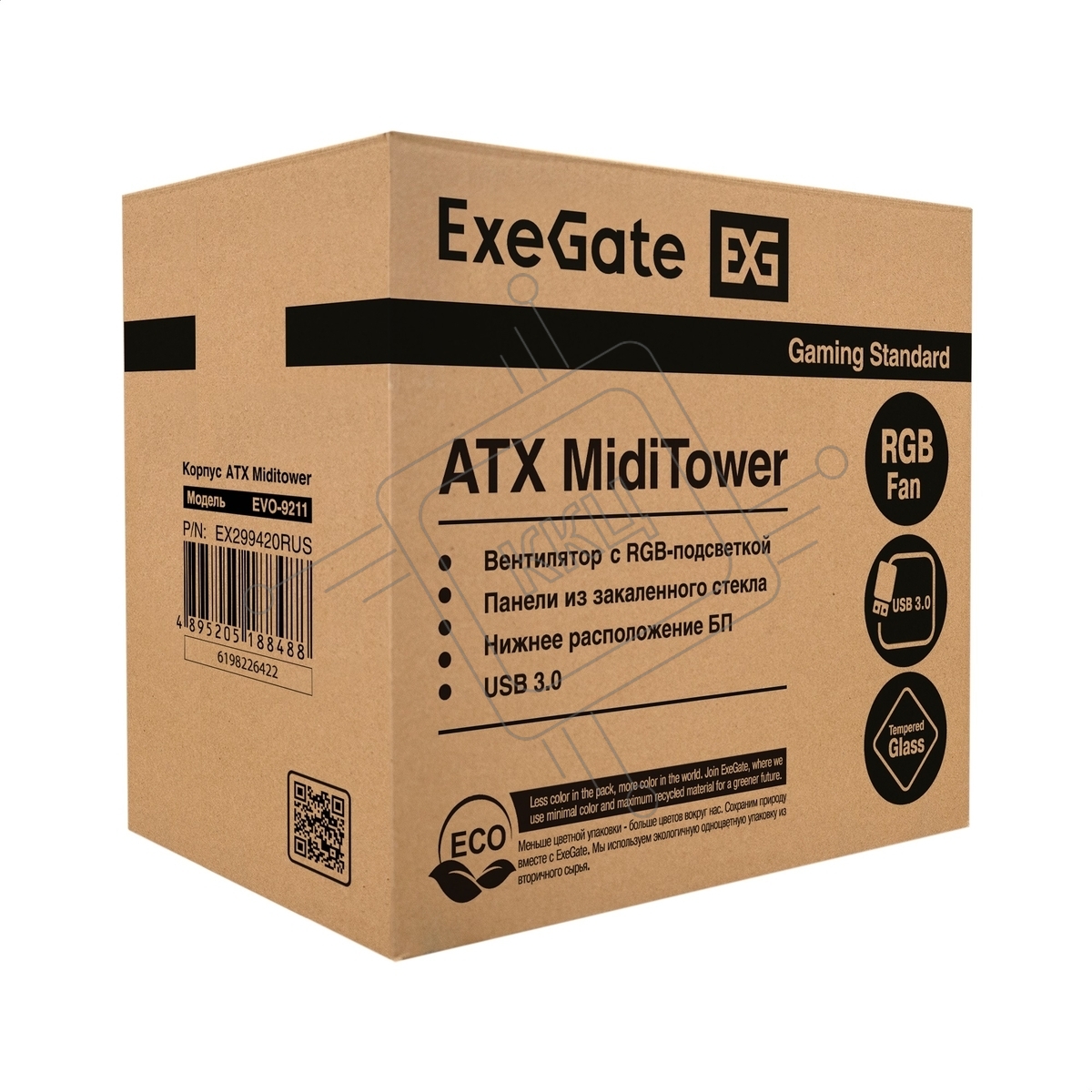 Компьютерный корпус Miditower ExeGate EVO-9211-800NPX (ATX, БП 800NPX с вент. 12см, с окном, 2*USB+1*USB3.0, HD аудио, черный, 1 вент. с RGB подсветкой)