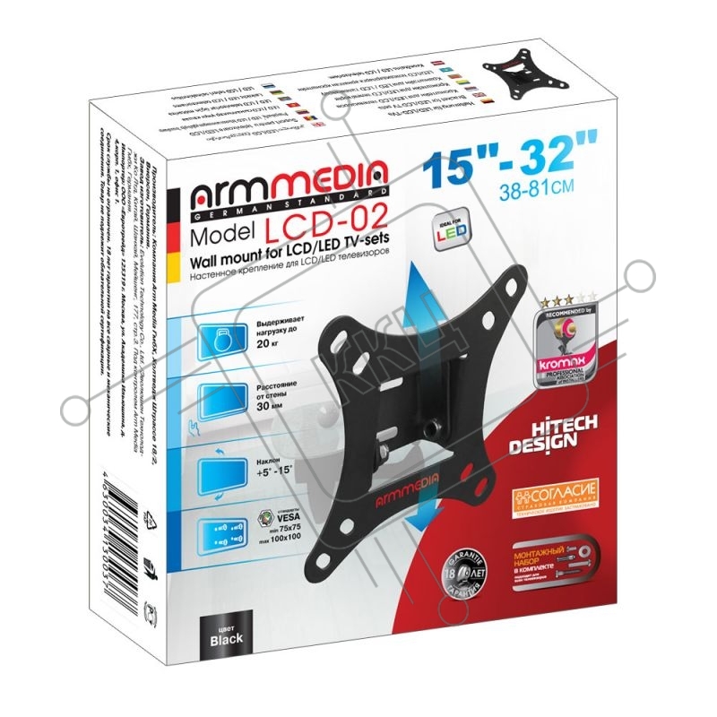 Кронштейн для телевизора Arm Media LCD-02 черный 15"-32" макс 20 кг настенный наклон