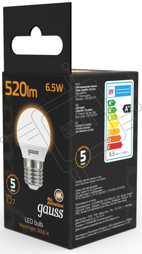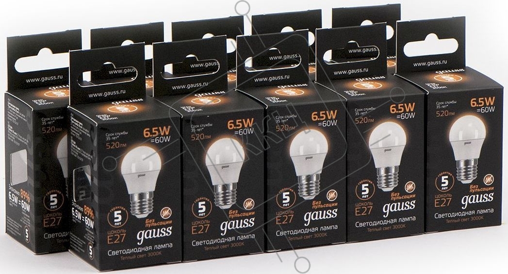 Лампа светодиодная Gauss Black 6.5Вт цок.: E27 шар 220B 3000K св. свеч. бел. теп. G45 (упак.: 10 шт)