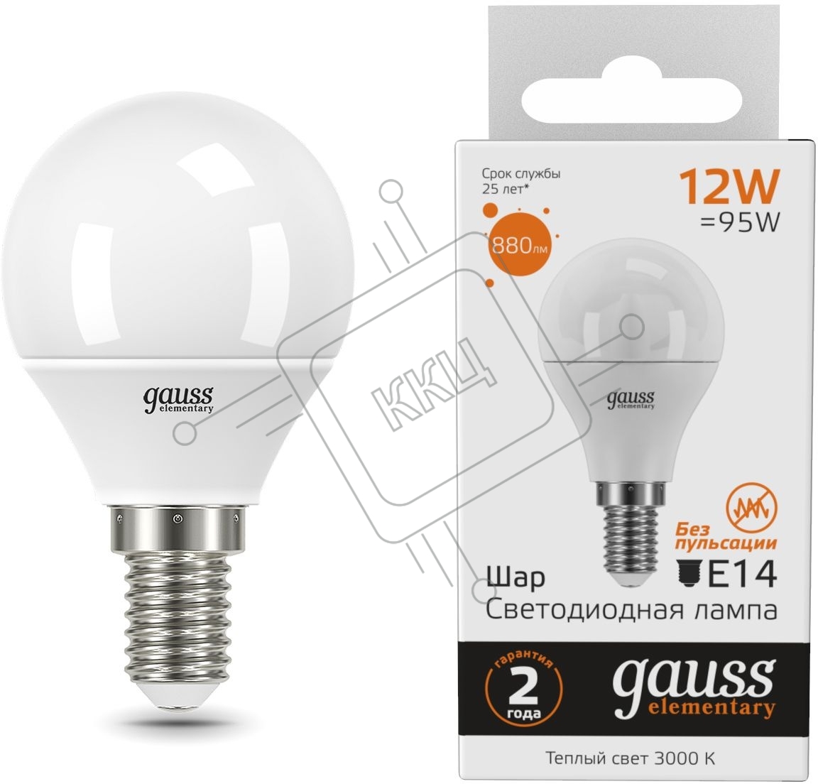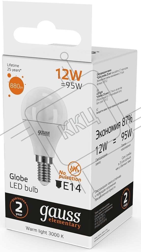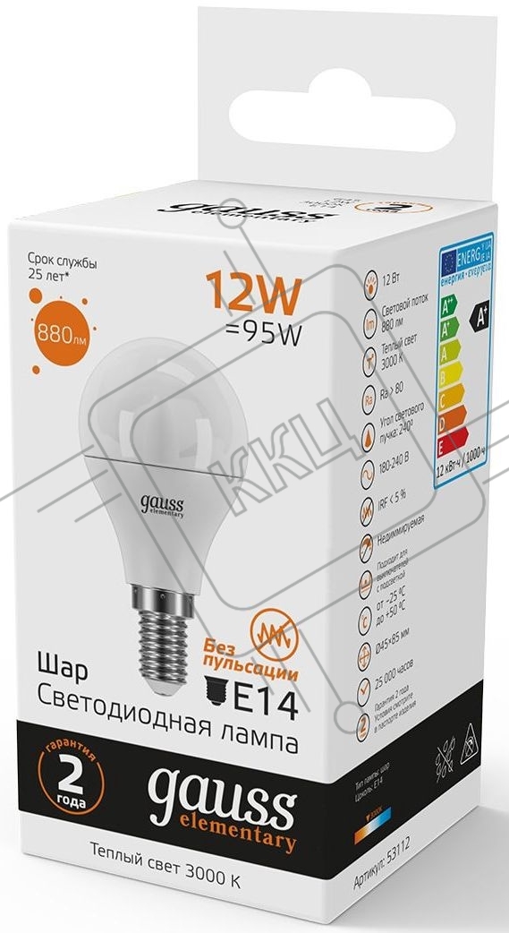 Лампа светодиодная Gauss Elementary 12Вт цок.: E14 шар 220B 3000K св. свеч. бел. теп. (упак.: 10 шт) (53112)