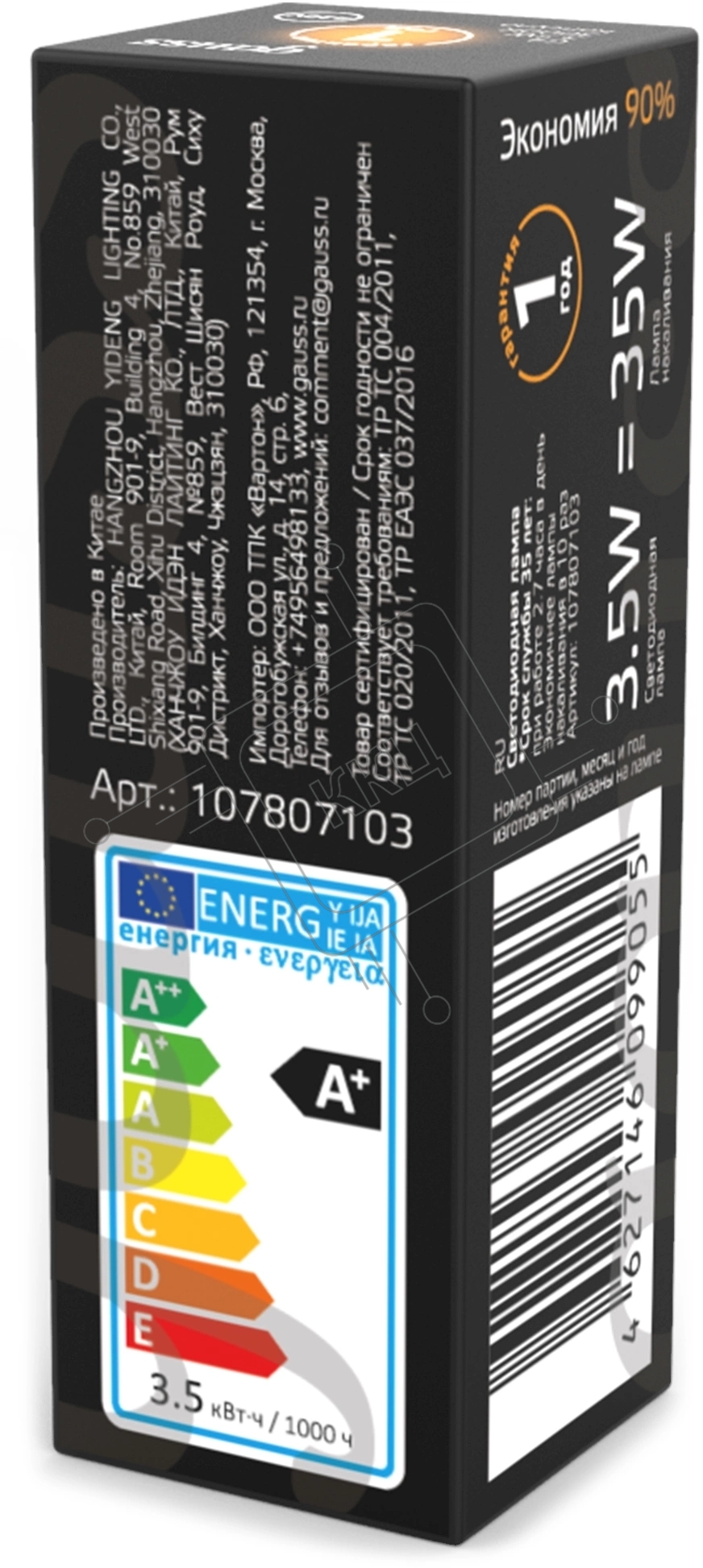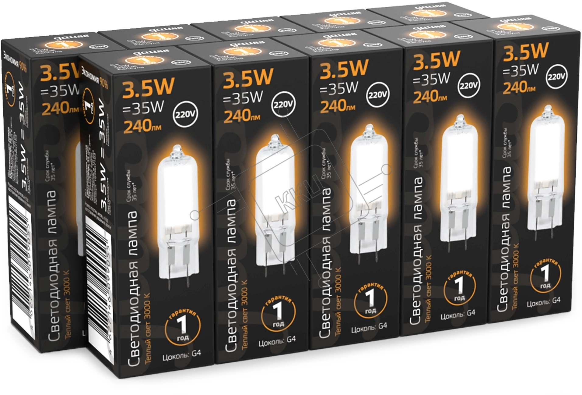 Лампа светодиодная Gauss G4 3.5Вт цок.:G4 капсул. 220B св.свеч.бел.теп. (упак.:10шт) (107807103)