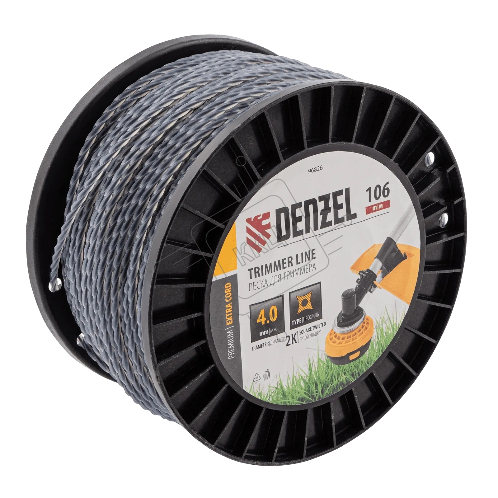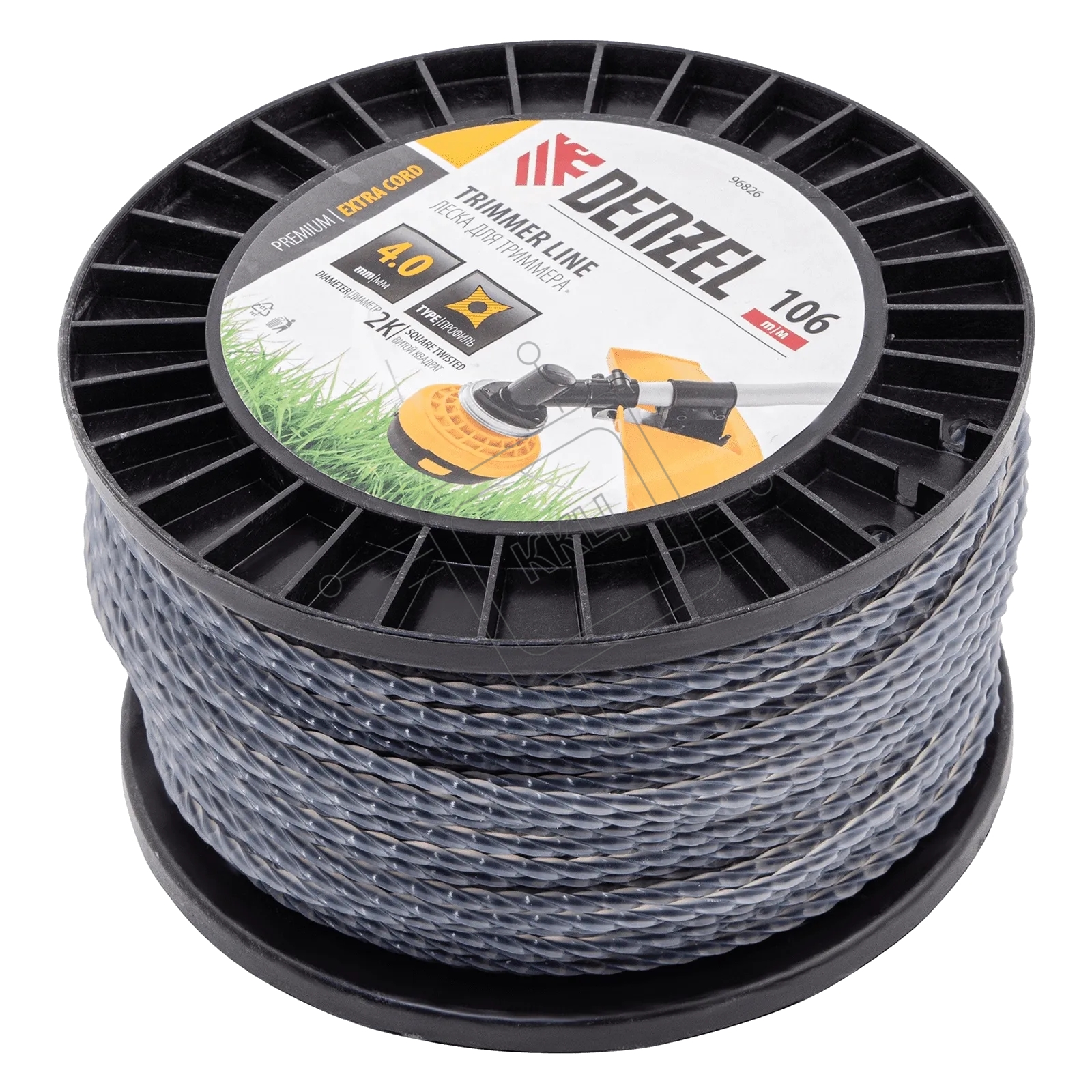 Леска для триммера Denzel двухкомпонентная витой квадрат, 4,0мм х 106м, на DIN катушке EXTRA CORD