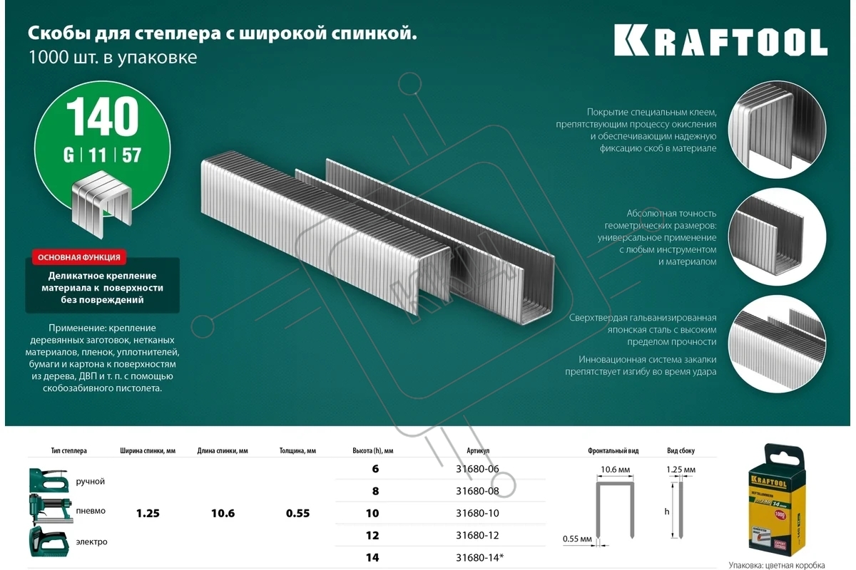 Скобы для степлера KRAFTOOL 14 мм широкие тип 140, 1000 шт