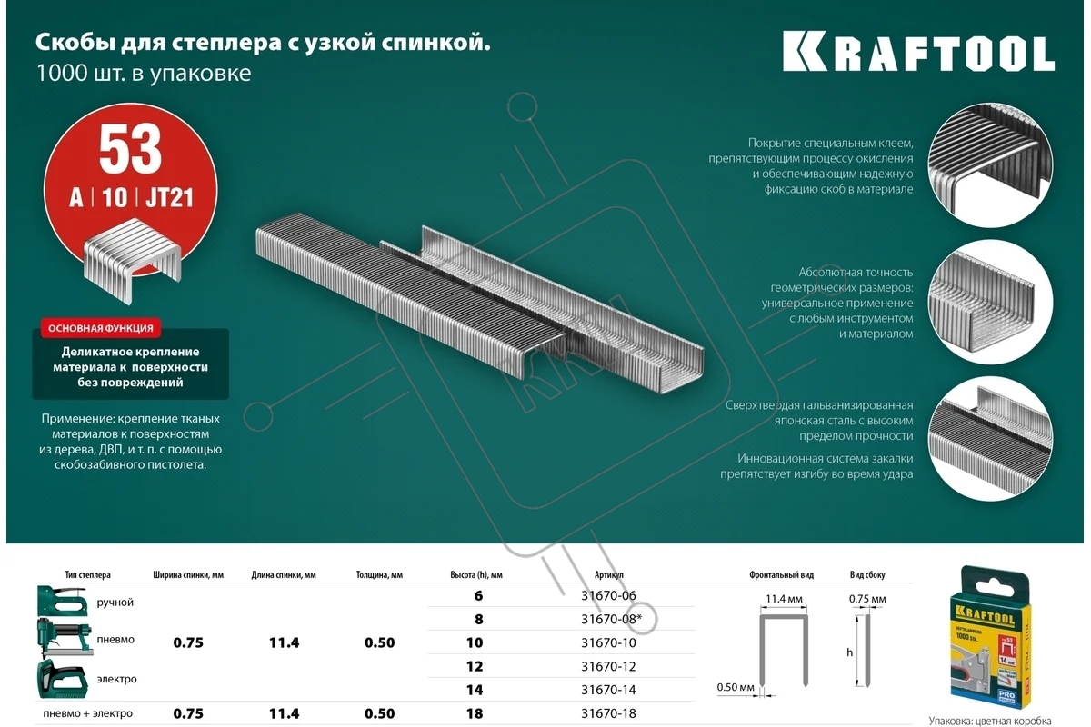 Скобы для степлера KRAFTOOL 14 мм узкие тип 53, 1000 шт