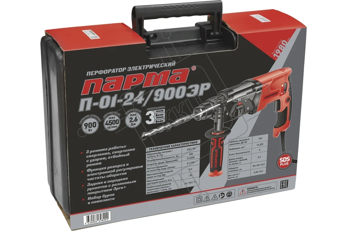 Перфоратор ПАРМА П-01-24/900ЭР 02.027.00003 900Вт,3-х реж,2,6Дж,SDS-plus, рег.об.,рев, пл.пуск,рук.Эрго+)(5ш/к)