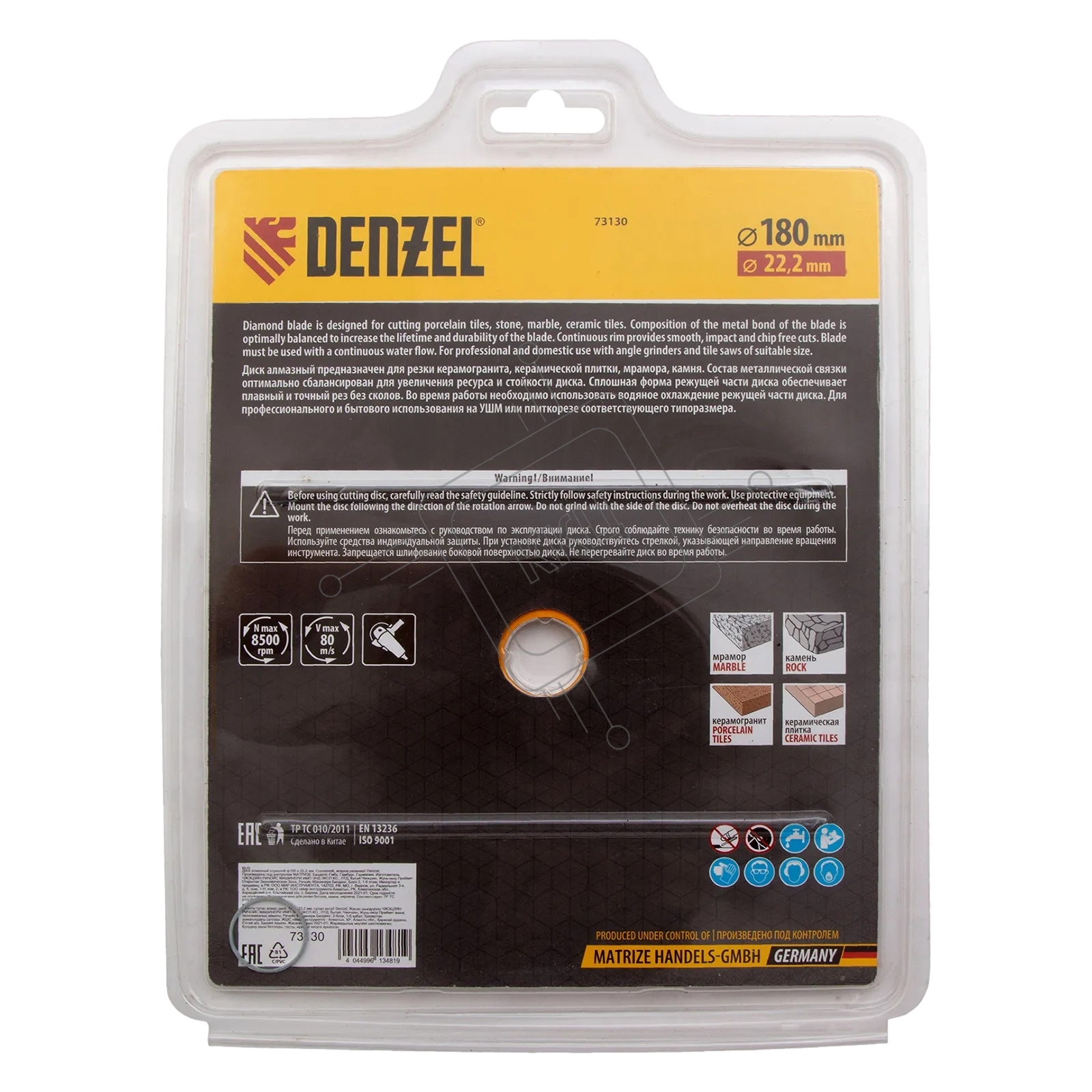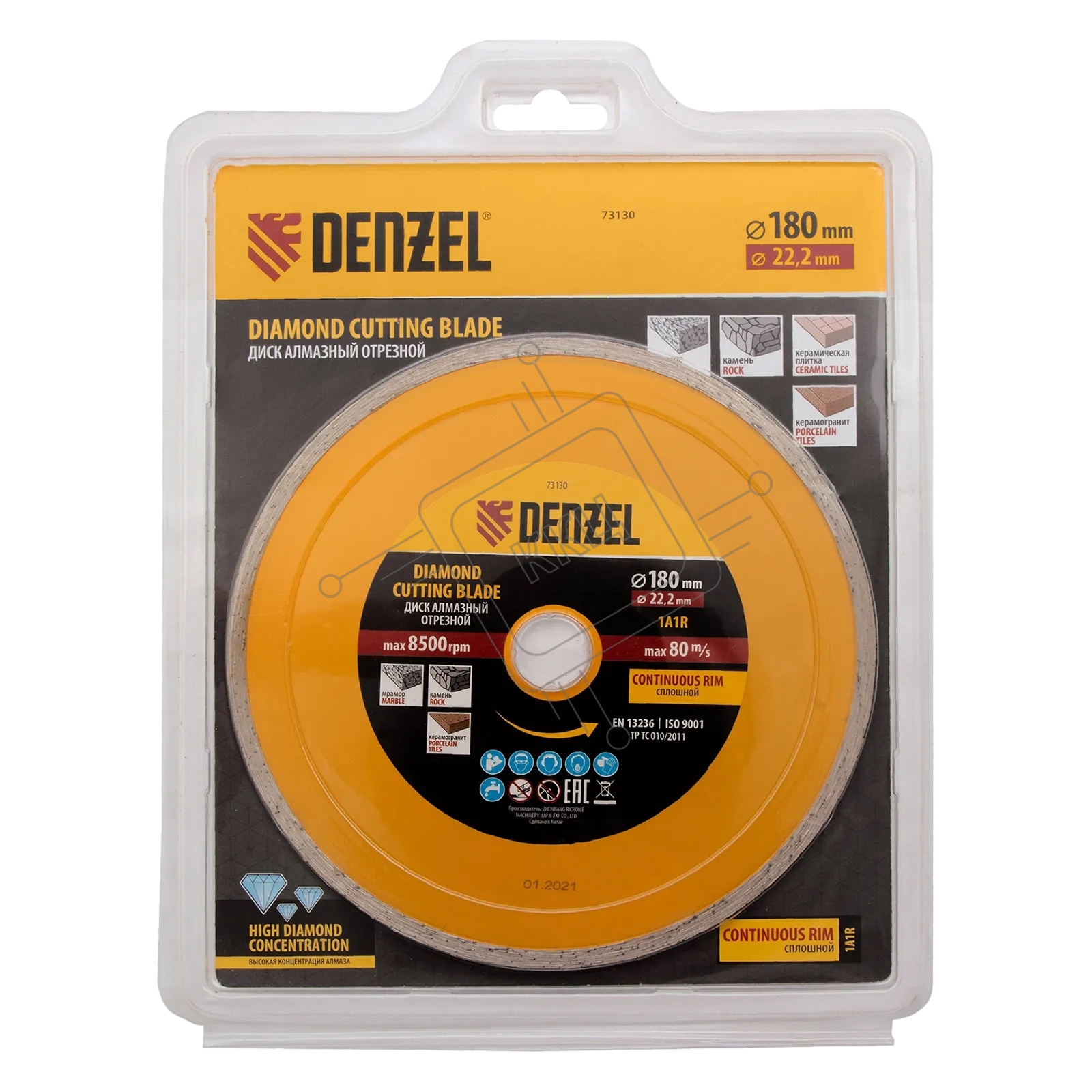 Диск алмазный отрезной Denzel ф180 х 22,2 мм, сплошной, мокрое резание