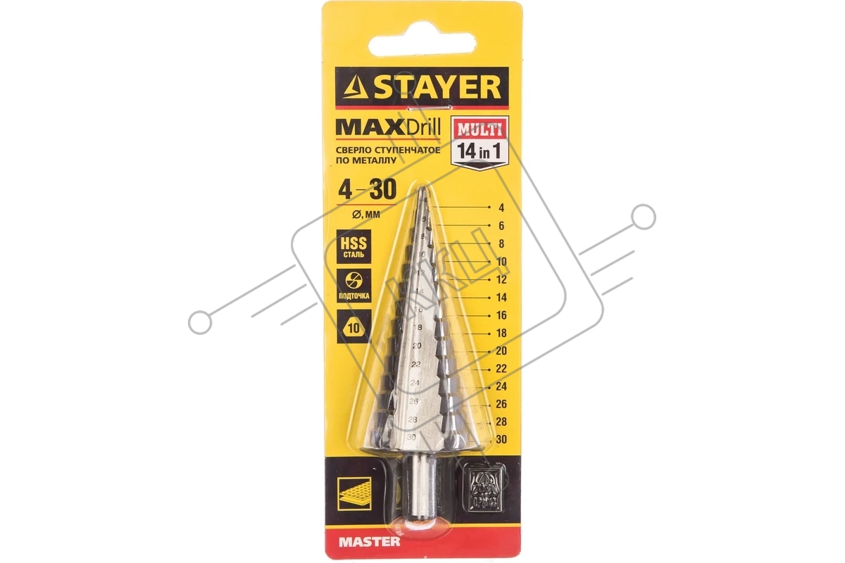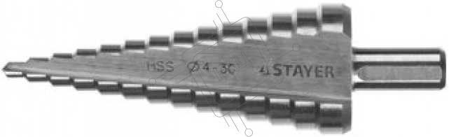 Сверло STAYER "MASTER" ступенчатое по сталям и цвет.мет., сталь HSS, d=4-30мм, 14ступ.d4-30, L-100мм, трехгран. хв.10мм 29660-4-30-14